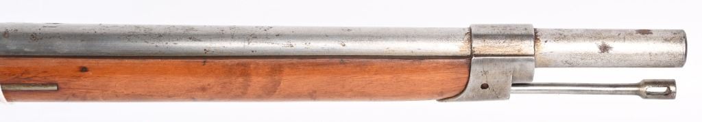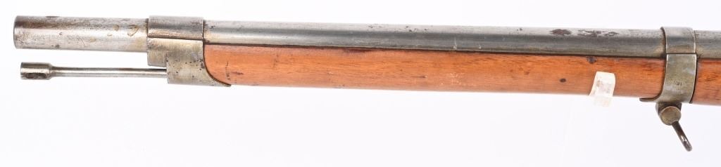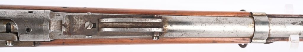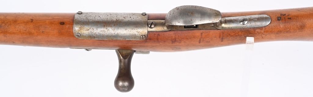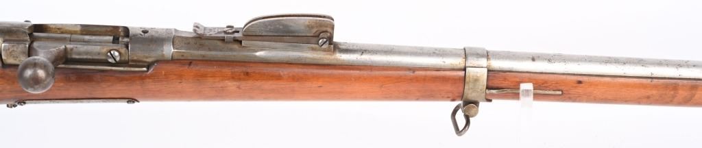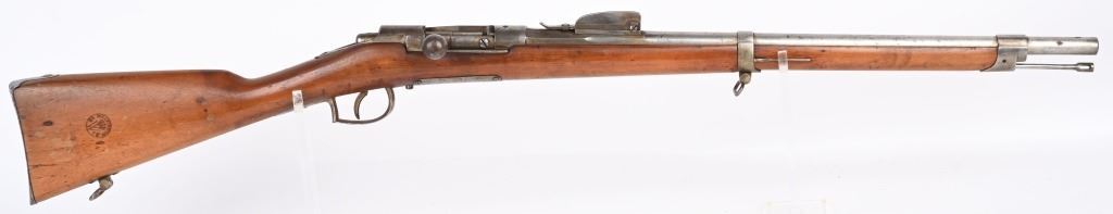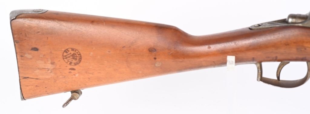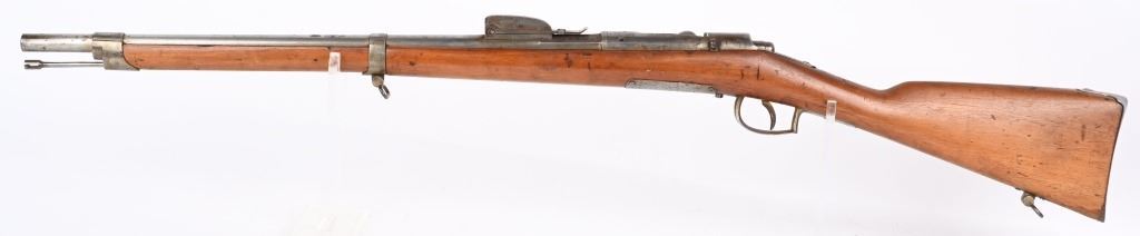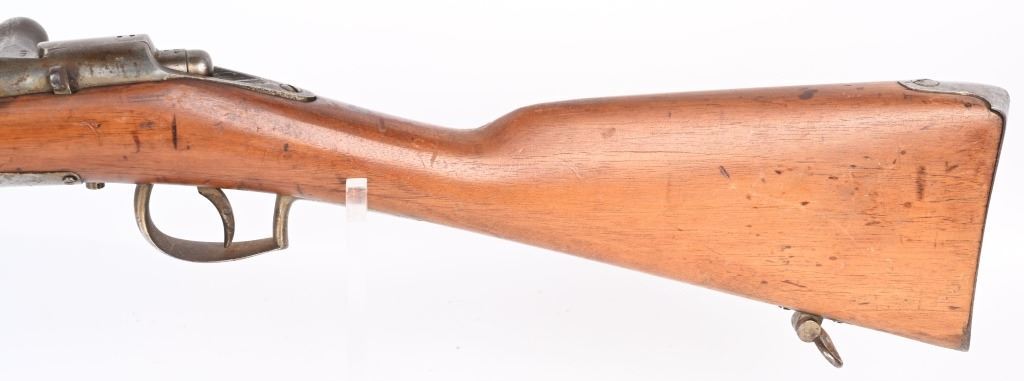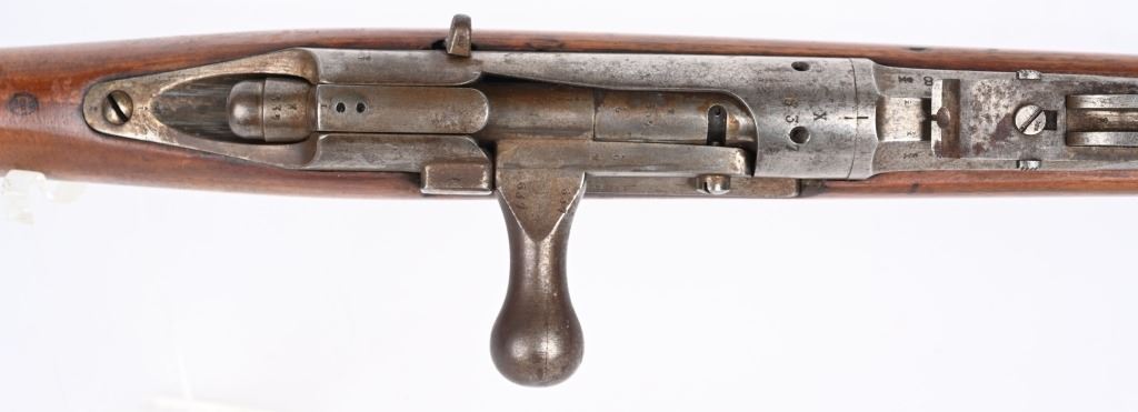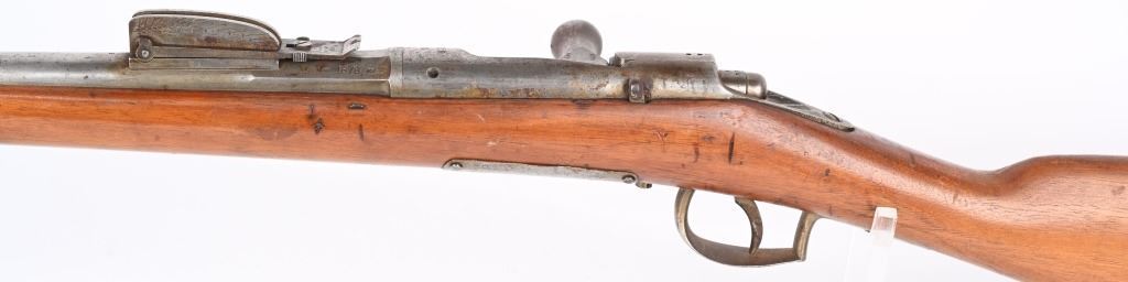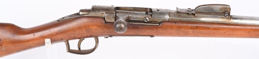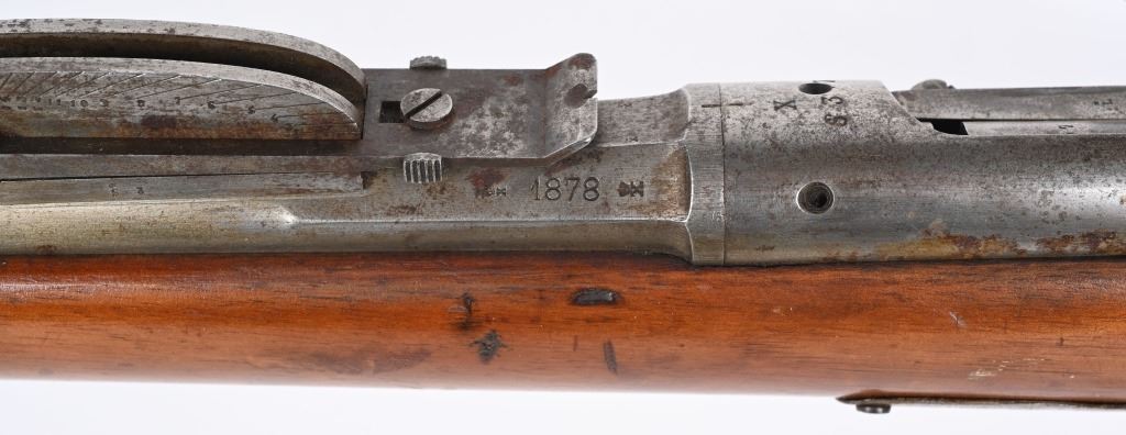 SERIAL: NUMBER: X637. BARREL: 23-1/2". CALIBER: 11X52MMR. MANUFACTURED: 1878. Cut down to short rifle/carbine length. Internal magazine feed (no tube). "MAASTICHT/1878" cartouche on the left side of the stock. No import marks found. Matching serials on the receiver and bolt components. Other parts are not numbered. No front sight, but the rear rifle sight remains. Metal components are in the white. Stock has been sanded and lacquered. Some small components are lacquered as well. CONDITION: Metal is good overall, with general wear. Some spots of brown patina have been formed. Wood has minor impressions. Bore is clean overall with strong rifling. Mechanically fine. ANTIQUE