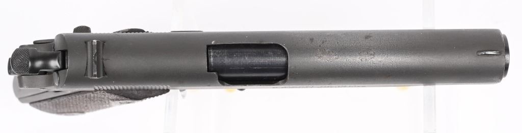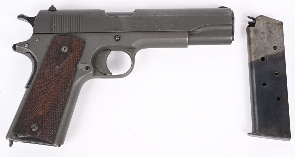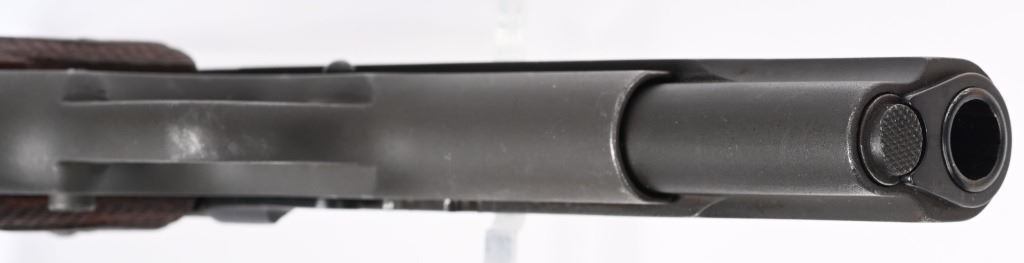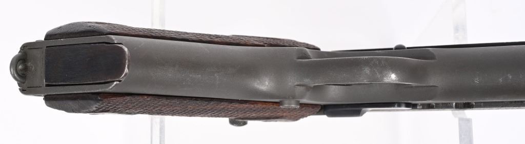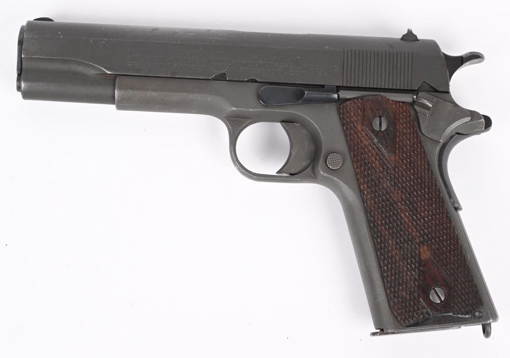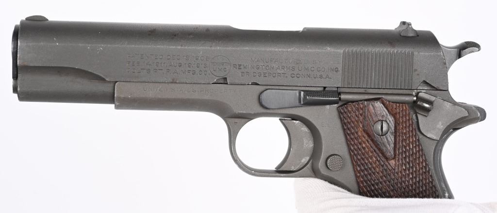 SERIAL NUMBER 9878 BARREL 5" CALIBER 45 ACP MANUFACTURED 1917. One of the least common and very desired WW1 production Model 1911 Gov't 45 Pistols ever produced. The Remington -UMC. Standard in configuration and an exact copy of the Colt produced model. Made to supplement the production of Colt. Slide has the "REMINGTON UMC" monogram in the center of the left side surrounded by 3 lines of patents and the Remington UMC address. The frame has the E.E.C. inspection only done on the REM/UMC 1911 pistol. The balance of the pistol is standard in every way with the exception of not having the "P" proof that the Colt variation had on its slide and frame. CONDITION. Very good as arsenal or depot refinished post WW1 for reissue. The bore is very good with strong rifling the grips are slightly worn but remain full sized and serviceable. C&R
