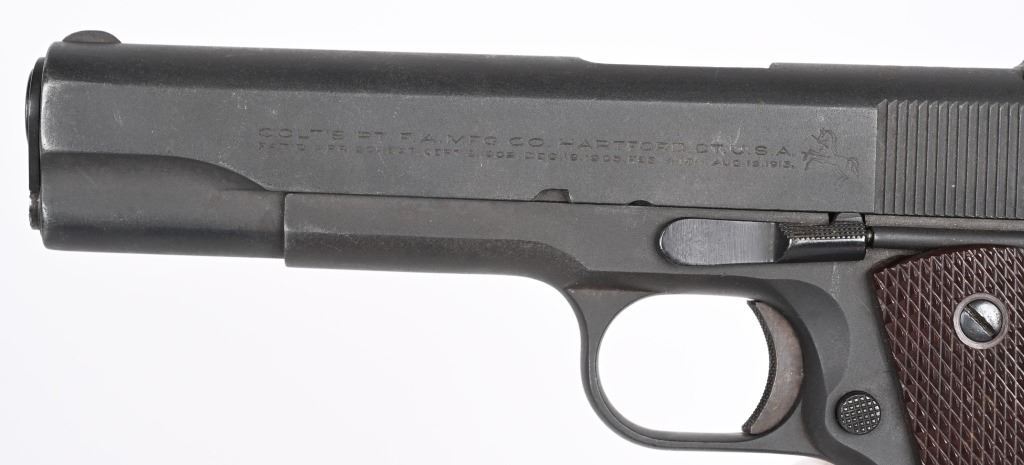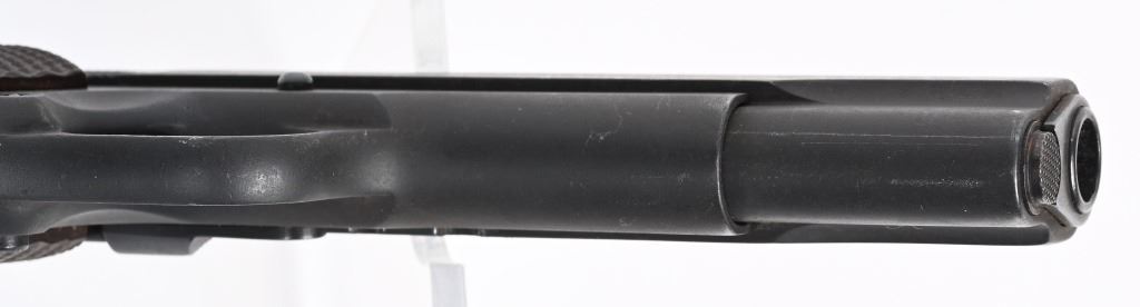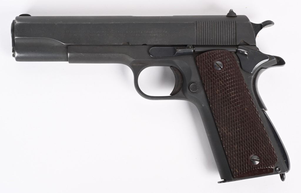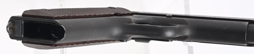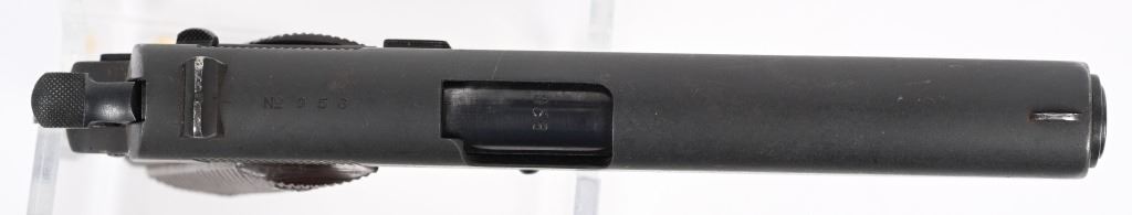 SERIAL NUMBER 956 BARREL 5" CALIBER .45 ACP, MANUFACTURED 1927-1937. Produced by Colt for the Argentine Military. Parkerized finish with checkered brown plastic grips. Short checkered trigger, checkered short wide hammer. Keys pattern brown fiber plastic grips. Matching numbers on frame, barrel and slide. CONDITION. Good as refinished with parkerized exterior over some very light areas of pitting. Action operates properly. Bore is good with slight frosting in corners of grooves. C&R