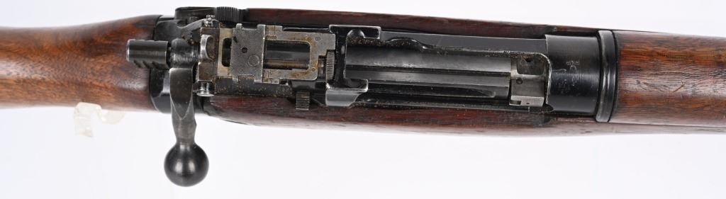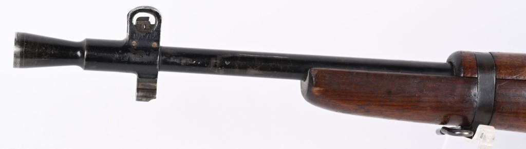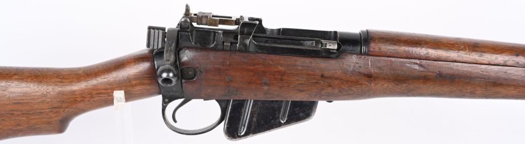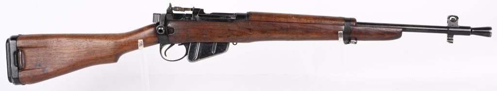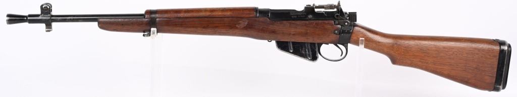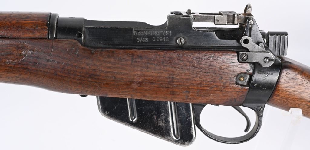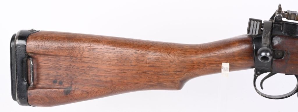 SERIAL NUMBER: Q2942. BARREL: 18". CALIBER: .303 BRITISH. MANUFACTURED: 1945. Dated "8/45" on the left side of the receiver. "F" marked for Fazakerly. Import marked on the left side of the stock socket. Matching serials on the receiver and bolt. Magazine is not numbered. Standard flash hider and sights. Original black enamel finish on the metal components. Barrel is correctly scalloped near the chamber. Oiled wood stock and furniture. Original rubber butt pad. CONDITION: Metal is good-very good overall, with some patches of light wear and finish loss. Wood has minor handling marks, scrapes and scratches. There is a light gouge on the left side of the stock, in front of the magazine. Bore is clean overall, with strong rifling retained. Rubber butt pad has hardened, which is typical for an original butt pad. Magazine has light scratches. C&R.