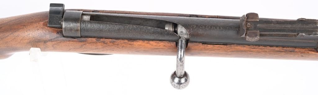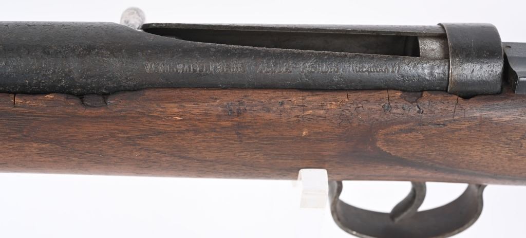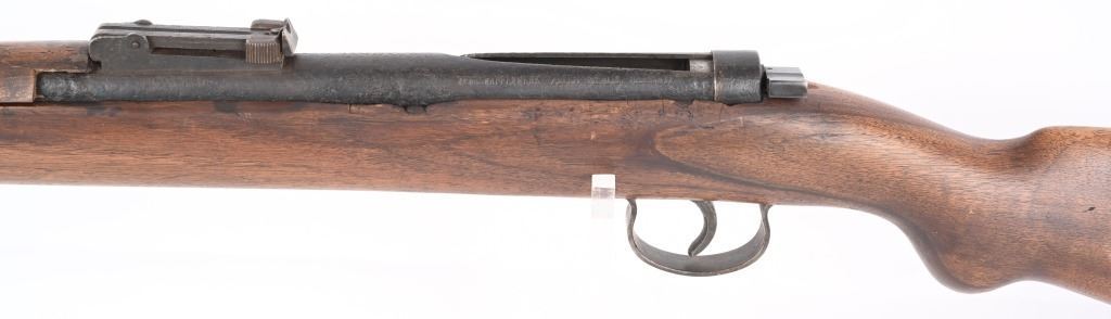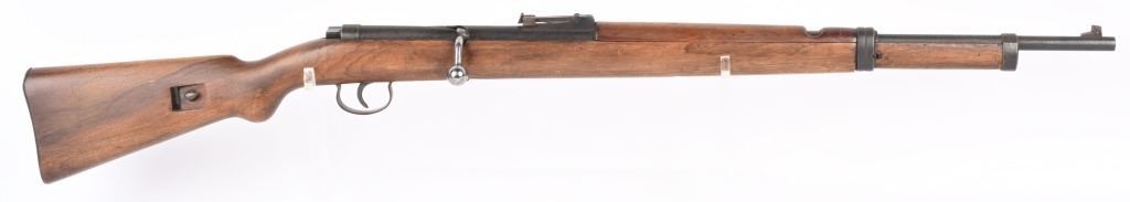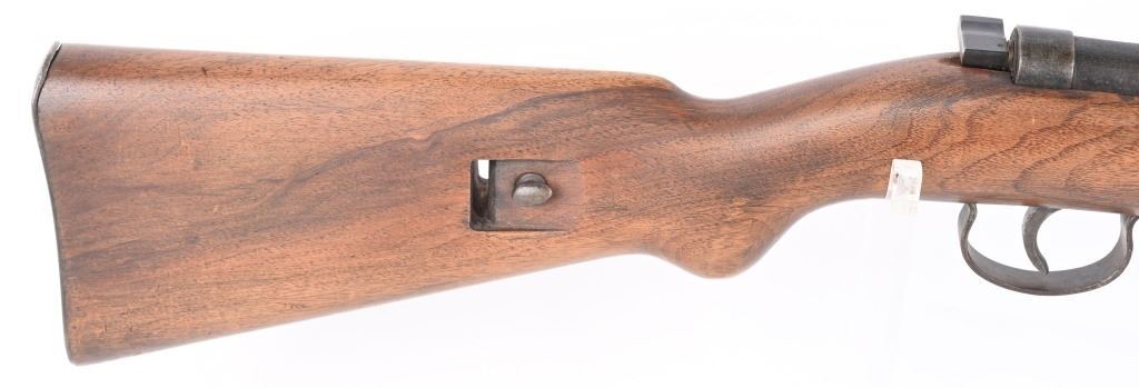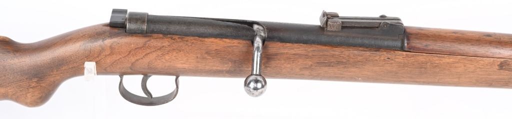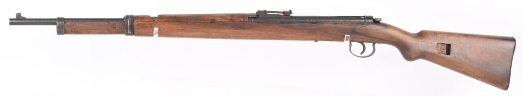 SERIAL NUMBER: NA. BARREL: 24". CALLIBER: 4.4MM BB. MANUFACTURED: 1930's. Made to resemble a German K98 rifle, and familiarize young German Boys with their future backbone. Marked "MARS 115" on the chamber. "L829292" marked on the wrist of the stock. Blade front sight and rear tangent, looking much like those on a K98. Blued finish on the metal components. Stock has been sanded and refinished. CONDITION: Metal is fair, with wear and areas of cleaned pitting. Stock has minor handling marks and scratches. The hand guard has a large chunk missing on the left side. Bore is worn. Safety does not seem to engage. AIRGUN
