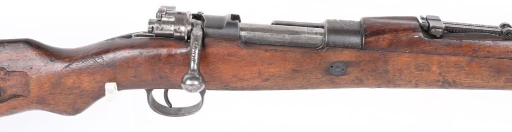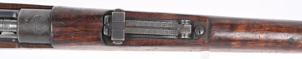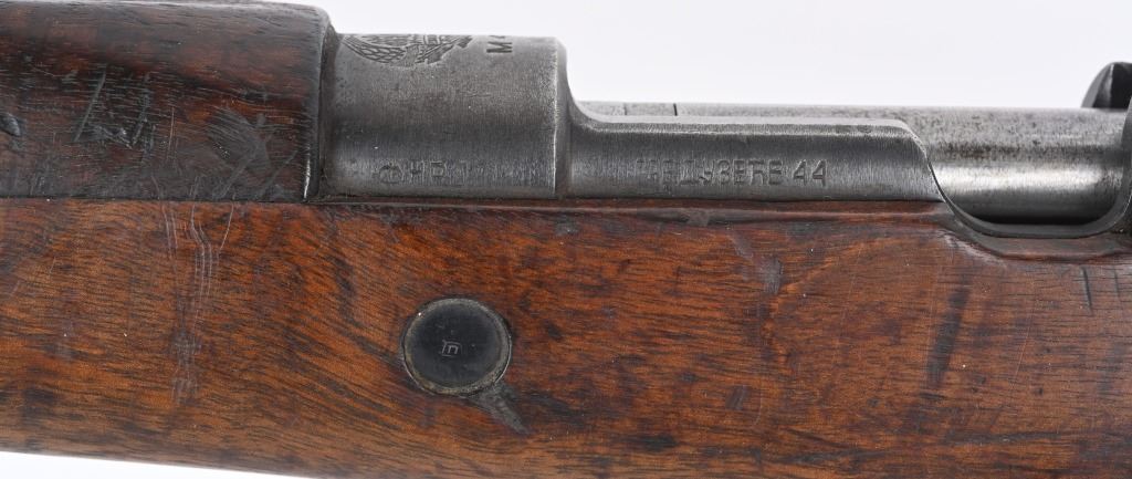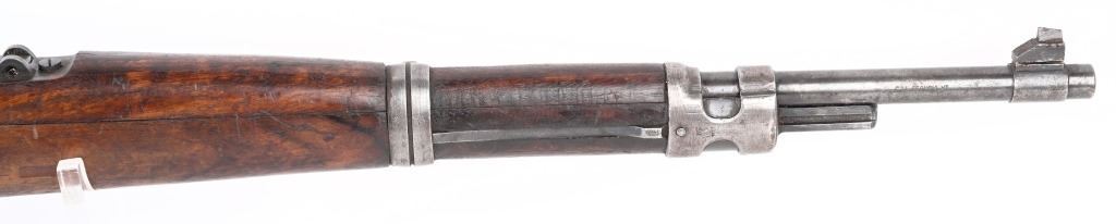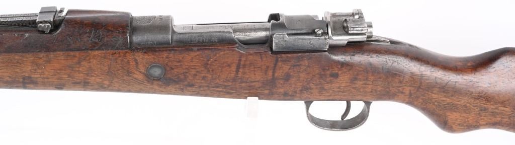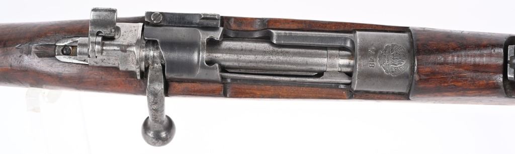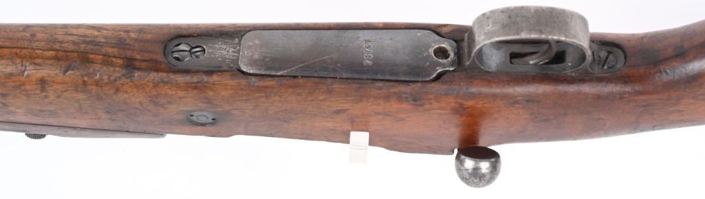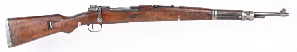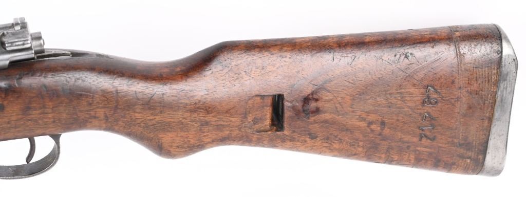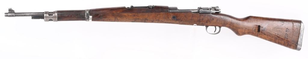 SERIAL NUMBER: A71767. BARREL: 23". CALIBER: 8MM. MANUFACTURED: 1950's. Strong crest on the chamber. Import marked on the barrel. Matching serials on the receiver, stock and floor plate. Bolt does not match. Standard sights. Military blued finish and oiled wood stock. Cupped metal butt plate. CONDITION: Metal is good overall, with general wear and handling marks. Wood has typical scrapes, scratches and dents. Bore is frosted with good overall rifling. Mechanically fine. C&R