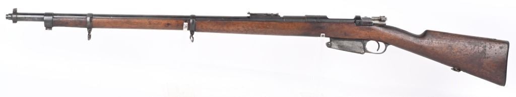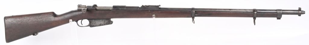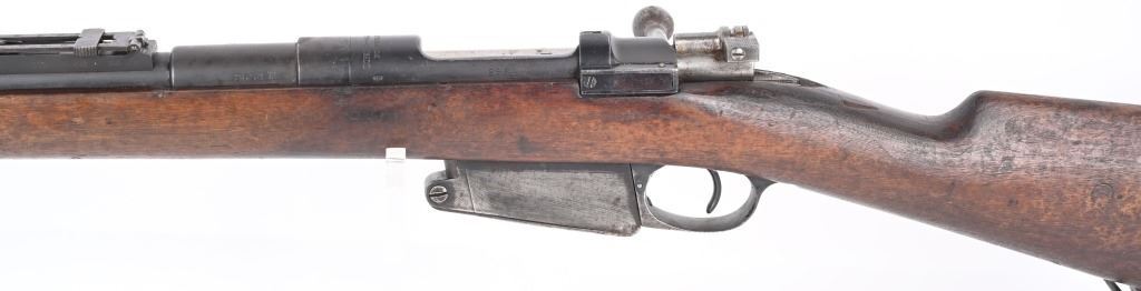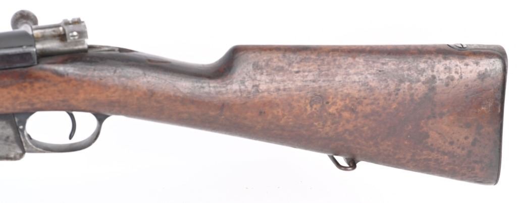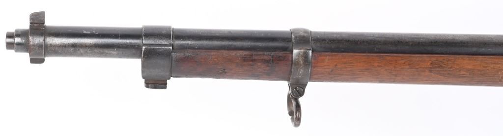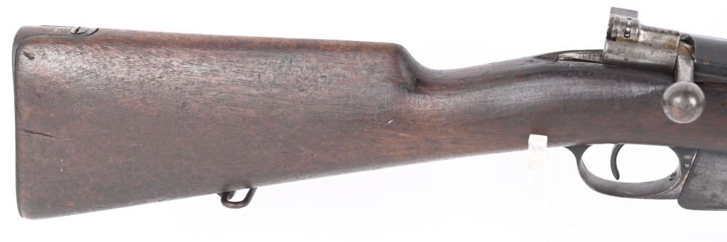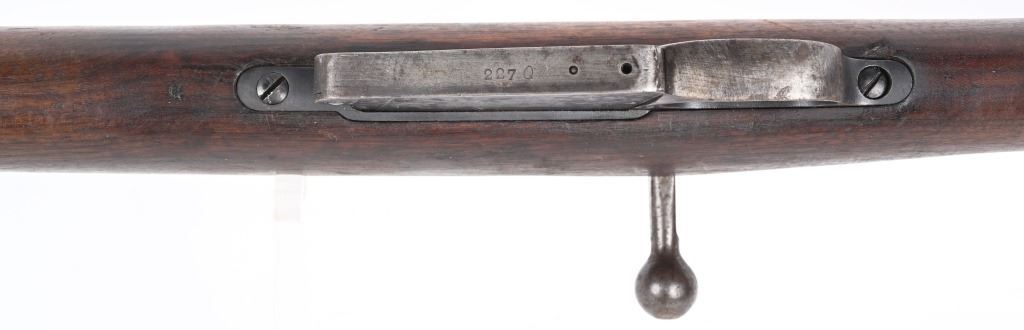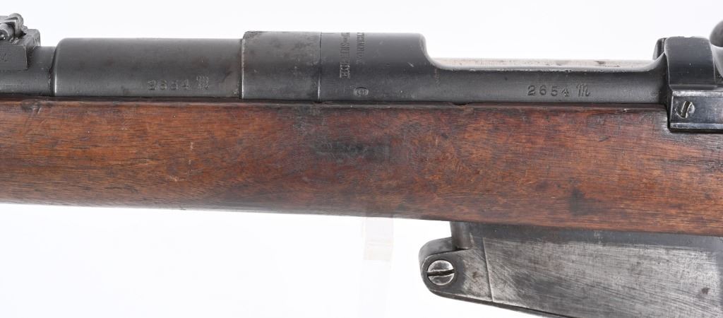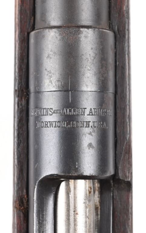 SERIAL NUMBER: 2654M. BARREL: 31". CALIBER: 7.65MM. MANUFACTURED: 1916. Made during WW1 on contract for the Belgian government. The receiver is marked "HOPKINS & ALLEN ARMS CO./NORWICH CONN U.S.A.". Only about 12,000 were shipped to the Belgian military. No import marks found. Matching serials on the barrel and receiver. Bolt and magazine are not matching. Standard sights. Military blued finish and oiled wood stock. Stock is duffel cut in front of the rear band. CONDITION: Metal is good overall, with general wear and gray patina. Magazine spring is weak. Wood has minor handling marks, scrapes and scratches. Bore is frosted with strong rifling retained. Mechanically fine. A very rare rifle in the U.S. today. C&R
