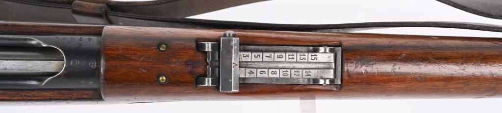 SERIAL NUMBER: 47864. BARREL: 23-1/2". CALIBER: 7.5X55 SWISS. MANUFACTURED: 1916. Swiss proofs on the chamber. Import marked on the barrel. Matching serials on the receiver, bolt and magazine. Standard blade front sight and rear 1500 meter tangent. Original blued finish and oiled wood stock. Includes attached original sling. CONDITION: Metal is good overall, with general wear and some light brown patina forming. Oiled wood stock with minor impressions and dents. Bore is shiny with crisp rifling. Mechanically fine. Sling has light wear and cracking. C&R