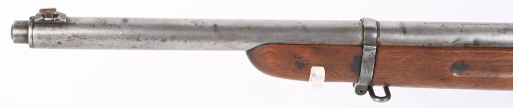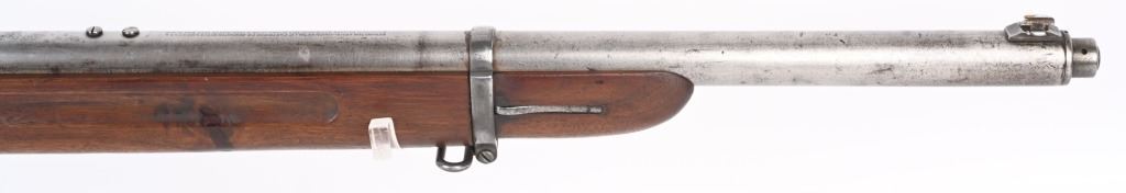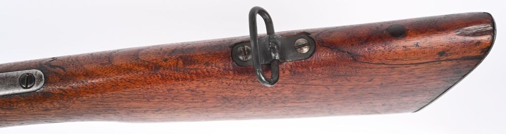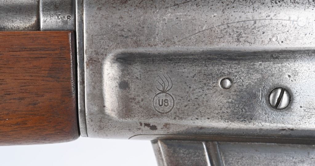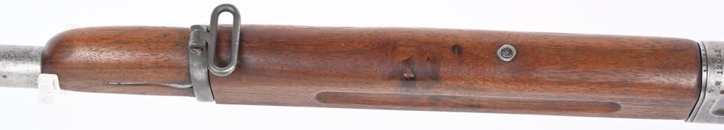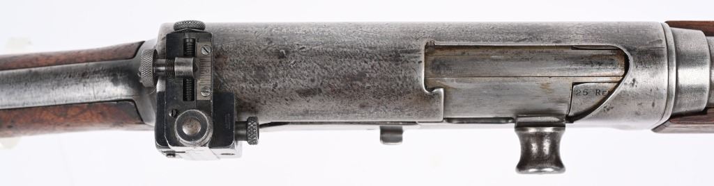 SERIAL 12032. BARREL 22". CALIBER .25 REM. The left side of frame is stamped with US ordnance bomb. Gun has the Lyman receiver sight with rear barrel sight removed. Stock shows no US cartouche stamps. Walnut fore-arm is a military style with finger groove and barrel band with swivel along with rear swivel. Condition. All metal is gray patina. Stock has some minor cracks and some trimming at comb. Bore is strong. C&R