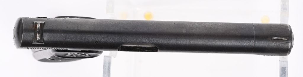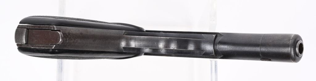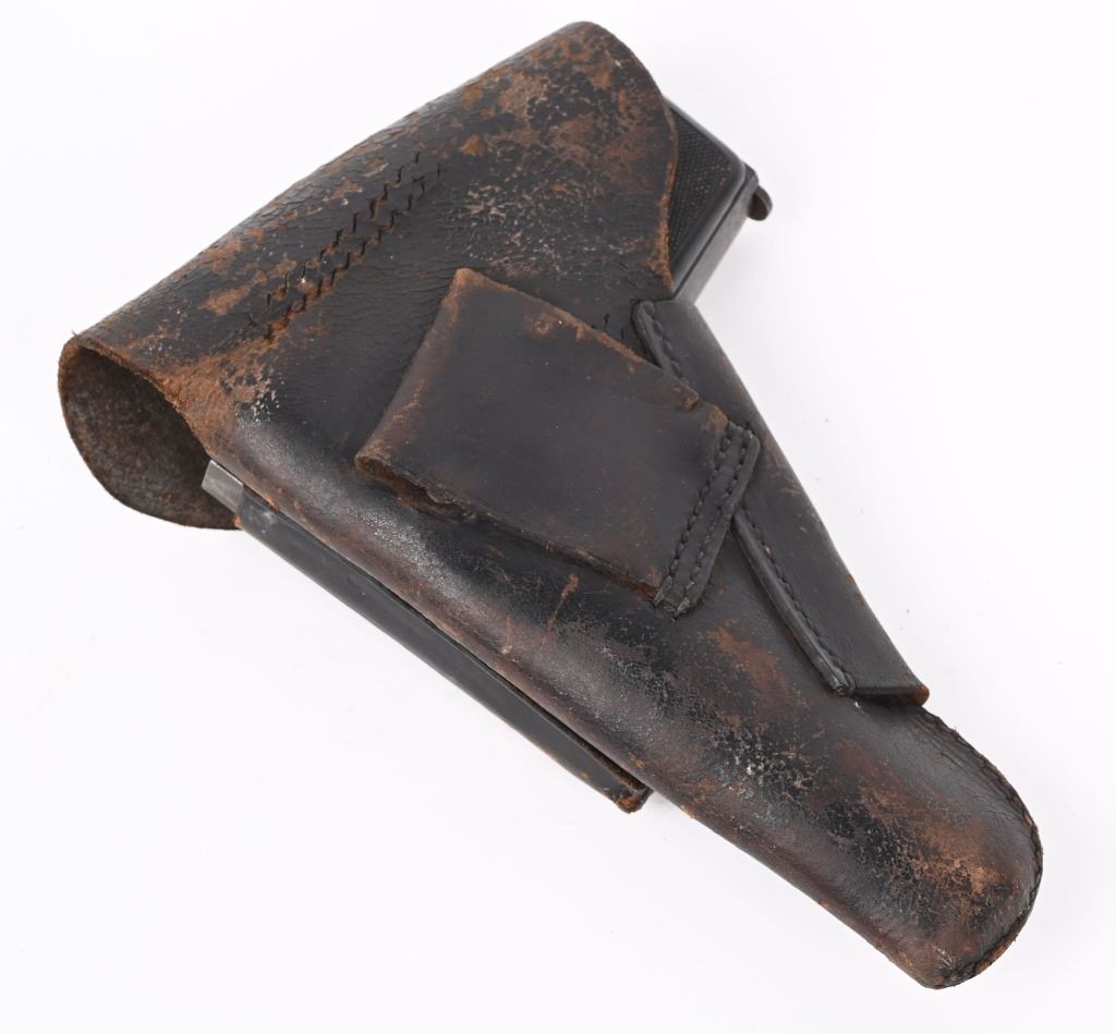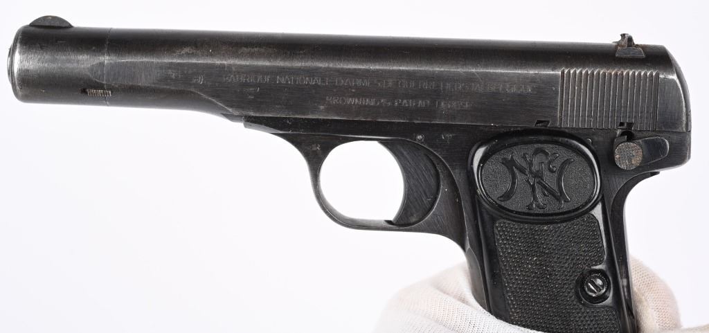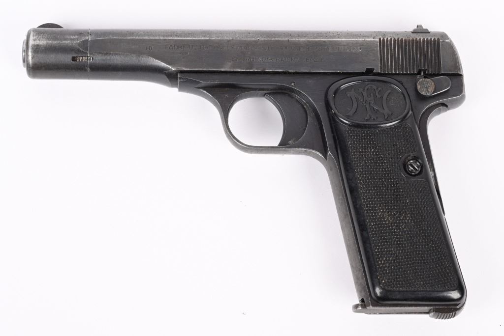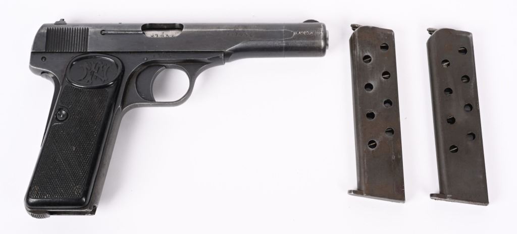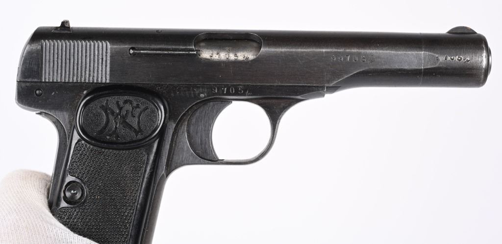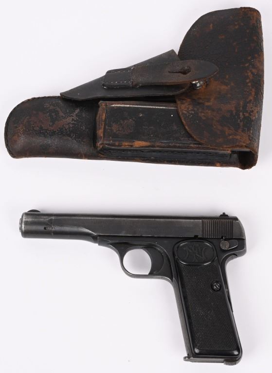 SERIAL NUMBER: 9705E. BARREL: 4-1/2". CALIBER: .32 ACP. MANUFACTURED: 1940'S. No import marks found. Matching serial numbers on the frame, slide, barrel and barrel nut. "eagle/N" proofs on the frame, barrel and slide. Blade front sight and u-notch rear. Original blued finish and checkered plastic grips. "FNH" monograms on the parkerized finished magazines. Includes black leather flap holster. No visible markings. CONDITION: Metal is very good overall, with light finish wear. Grips have a few scrapes and scratches. Bore is clean overall with crisp rifling. Magazines have light finish wear. Holster has heavy finish wear and crazing. Stitching remains tight. C&R