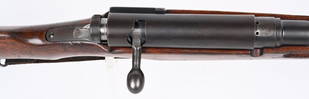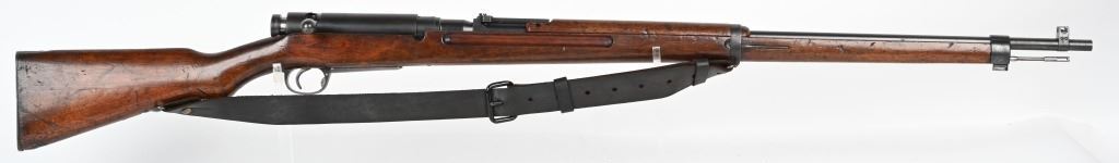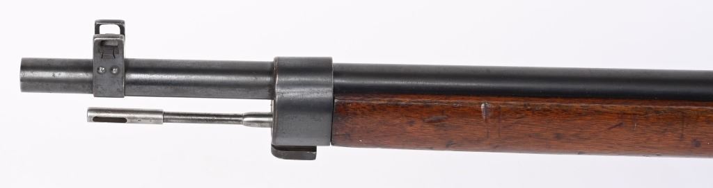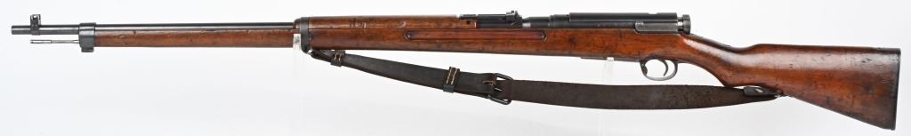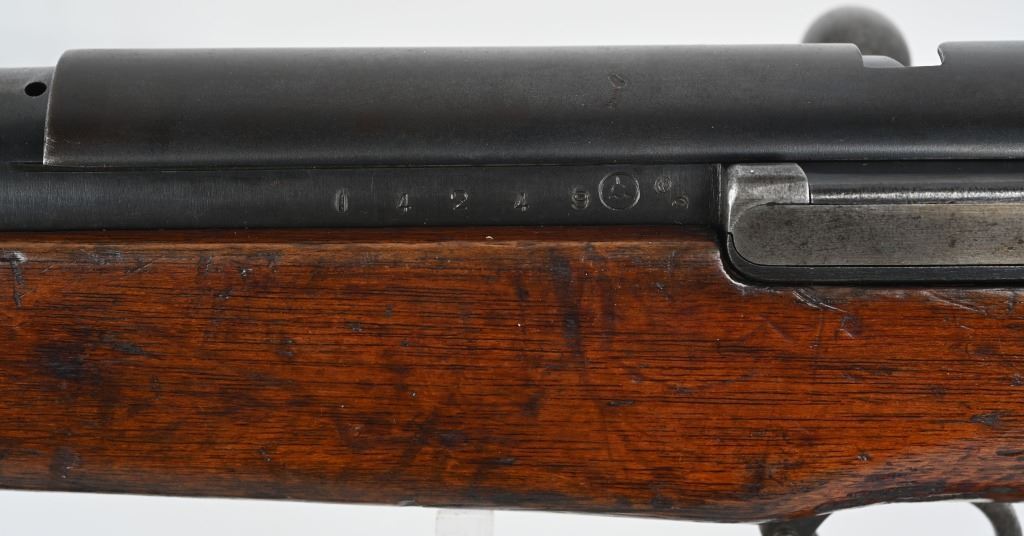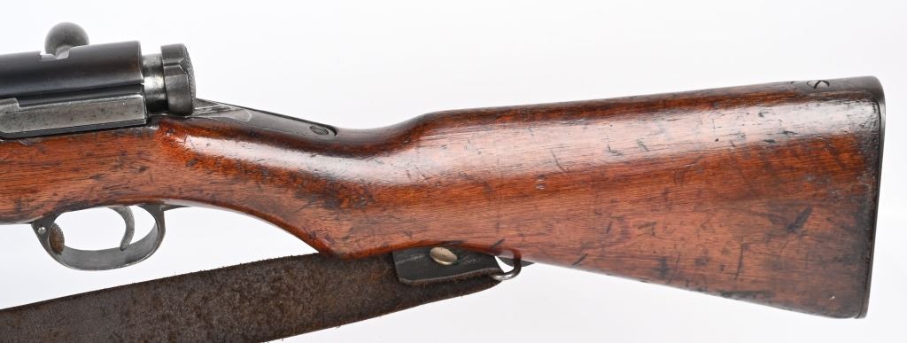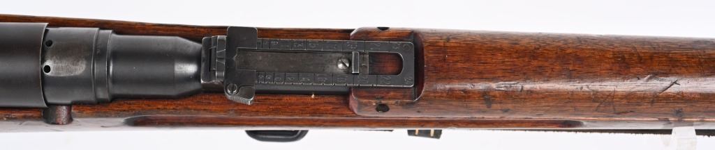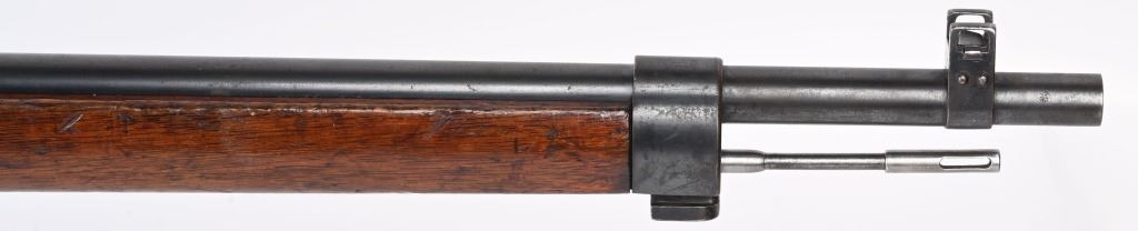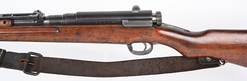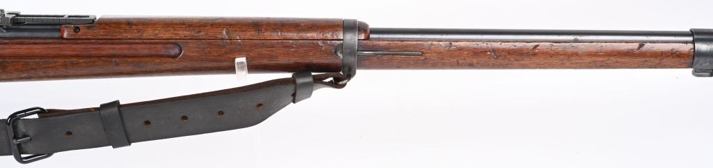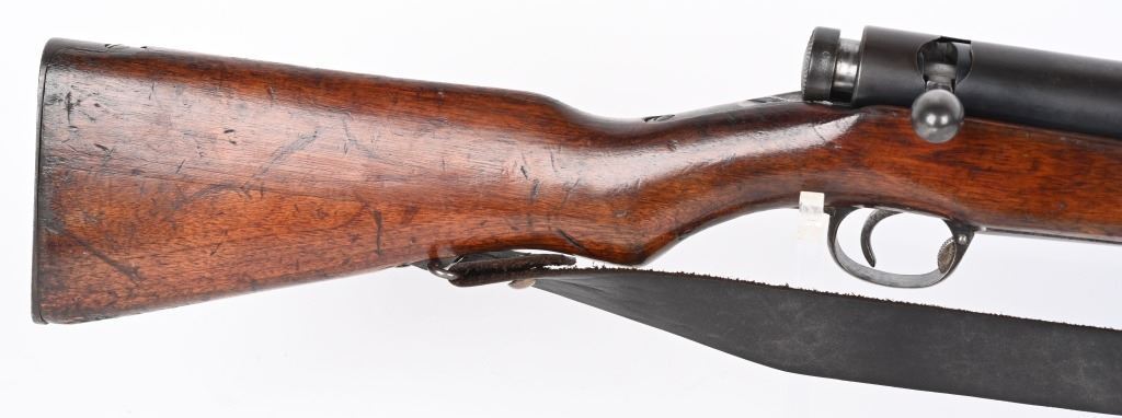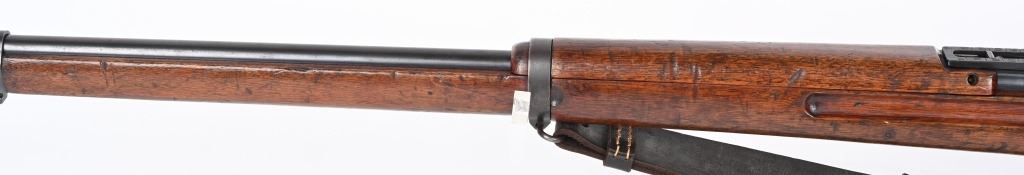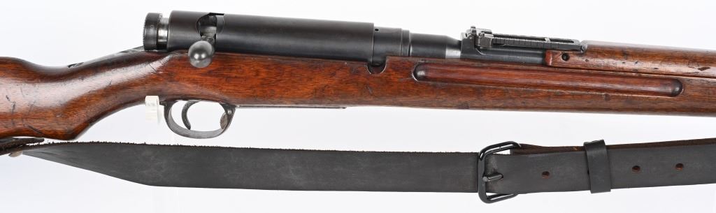 SERIAL NUMBER: 14249. BARREL: 31-1/2". CALIBER: 6.5 JAPANESE. MANUFACTURED: 1930'S. Made at the Mukden arsenal in captured Manchuria China. Mum has been ground, but model markings remain. No import marks found. Receiver serial number does not match the front band, or the bolt/bolt components. Bolt components (including the dust cover) match the front band and the floor plate. Standard barrel length and original sights. Military blued finish and oiled two piece wood stock. Includes replacement cleaning rod and attached reproduction leather sling. CONDITION: Metal is very good overall, with general wear and brown patina forming in areas. Wood has handling marks, scrapes, scratches and dents. Bore has some light frosting in the grooves. Very good overall rifling retained. Mechanically fine. Sling has light wear. C&R