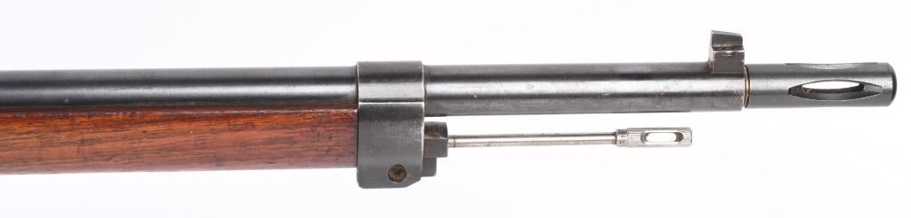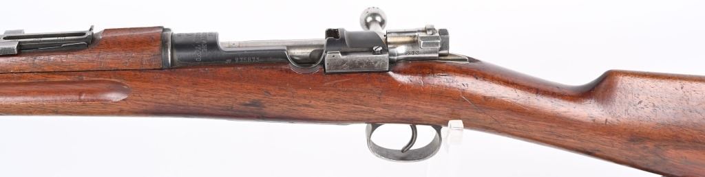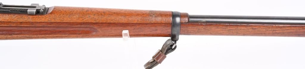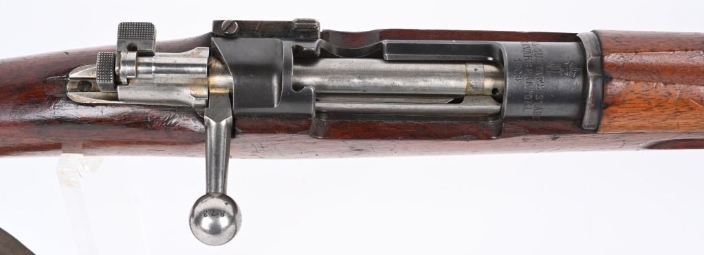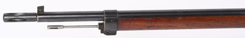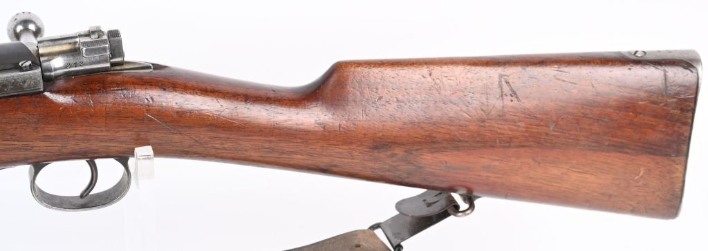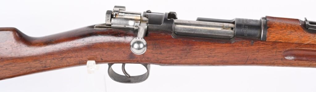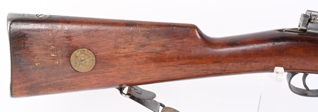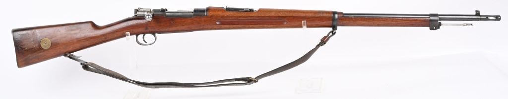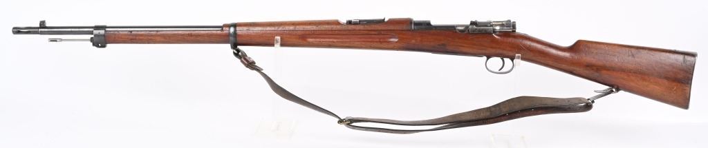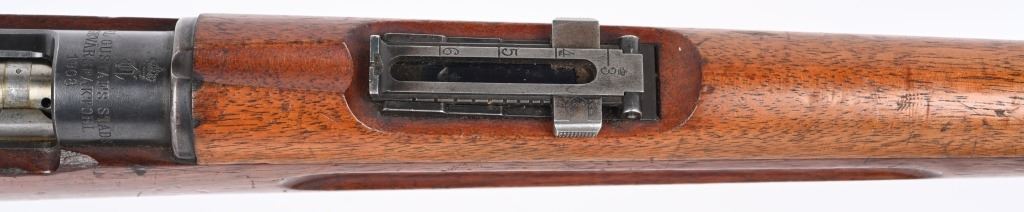 SERIAL NUMBER: 235873. BARREL: 29-1/2". CALIBER: 6.5X55. MANUFACTURED: 1908. Made at the Carl Gustafs factory, with such markings on the top of the receiver, in addition to a Swedish crown. Import marked on the barrel. Matching serials throughout, minus the bands and cleaning rod. Standard sights and threaded muzzle. Includes attached flash hider and original leather sling. Original military blued finish and oiled wood stock. Unit disc on the right side. CONDITION: Metal is very good overall, with light wear. Wood has typical surplus dings, scratches and dents. Bore is clean overall, with strong rifling retained. Mechanically fine. C&R