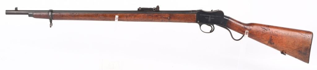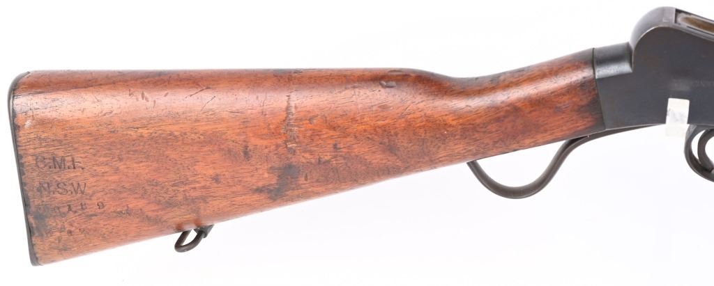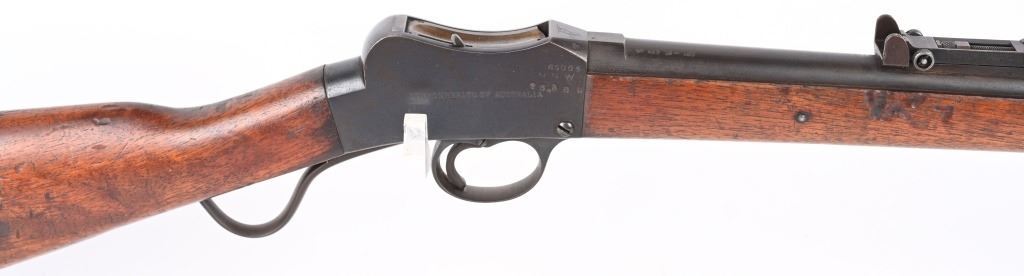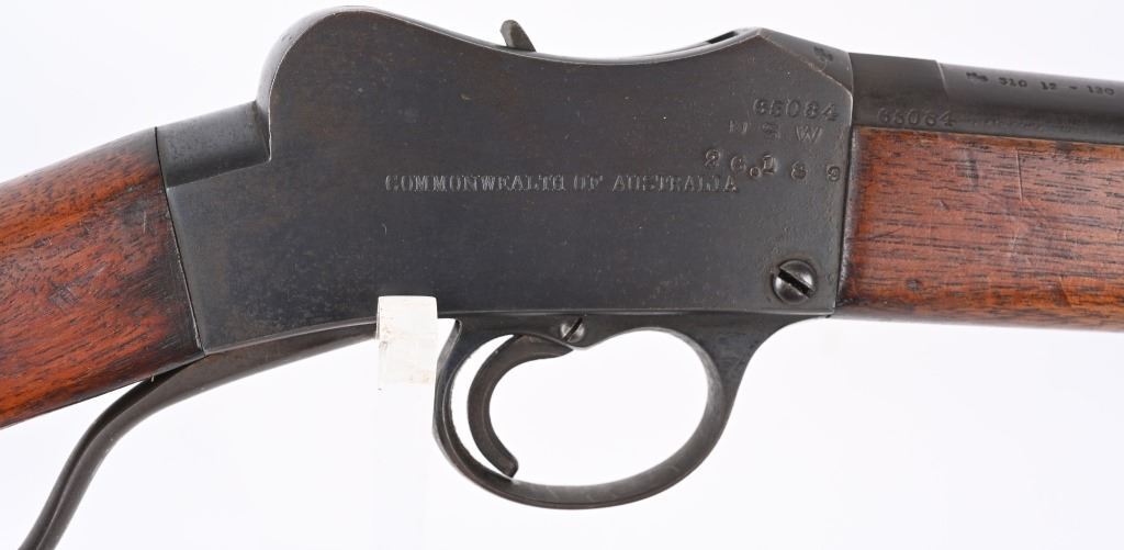 SERIAL NUMBER: 65084. BARREL: 25". CALIBER: .310 CADET. MANUFACTURED: 1920's. Made by BSA and shipped to Australia. "COMMONWEALTH OF AUSTRALIA" marked on the right side of the frame. There is a Kanagroo marked on the top of the chamber. Standard sights. Blued finish and oiled wood stock/forearm. Left side of the butt has some kind of unit marks. CONDITION: Metal is good overall, with general wear and some areas of brown patina. Wood has a few minor scrapes, scratches and dents. Bore has some light frosting in the grooves. Rifling remains strong. Mechanically fine. C&R