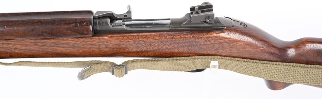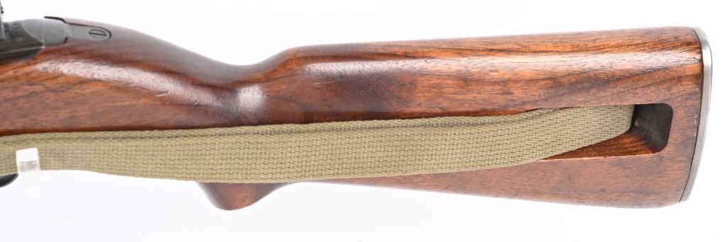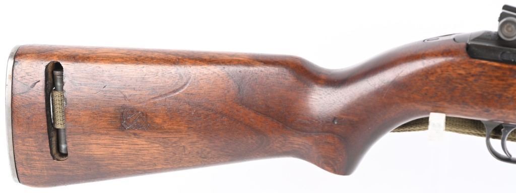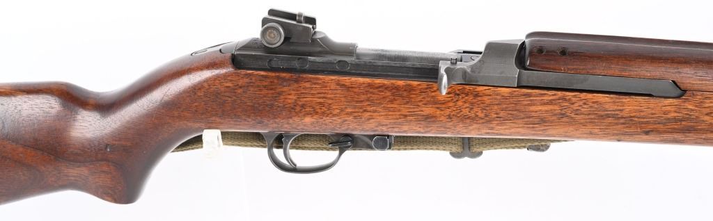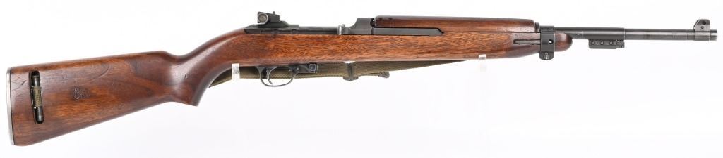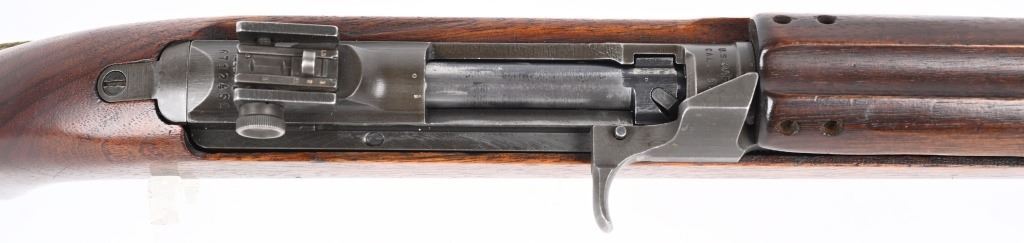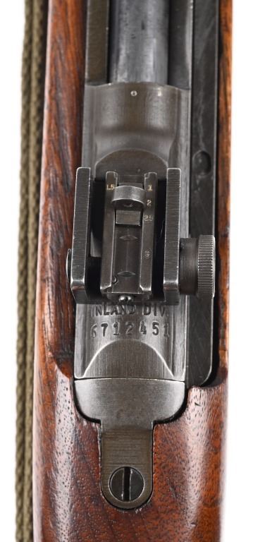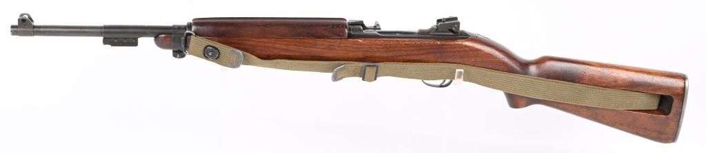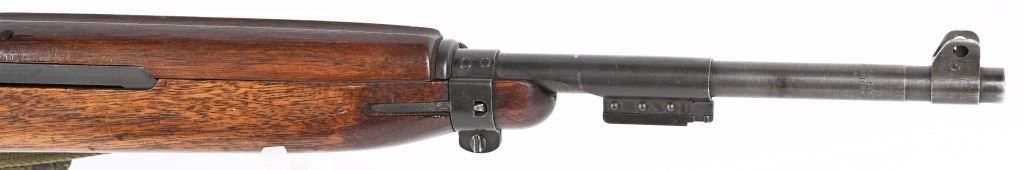 SERIAL NUMBER: 6712451. BARREL: 18". CALIBER: .30 CARBINE. MANUFACTURED: 1945. Inland Division production barrel, being dated "12-44". Trigger group, slide, bolt (round), bayonet lug/band and rear sight are all Inland production. Stock and hand guard are Inland production. Standard late war sights. Original parkerized finish and oiled wood stock. No magazine. Includes attached green canvas sling (undated) and metal oiler. CONDITION: Metal is very good overall, with general wear. Wood has a few handling marks and scratches. Bore is clean overall with strong rifling. Mechanically fine. C&R