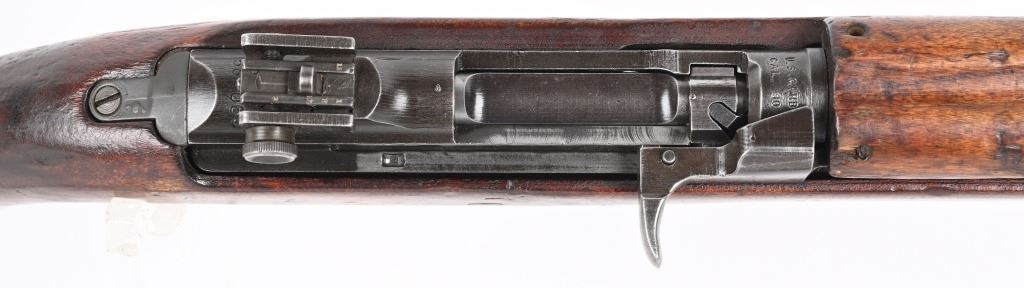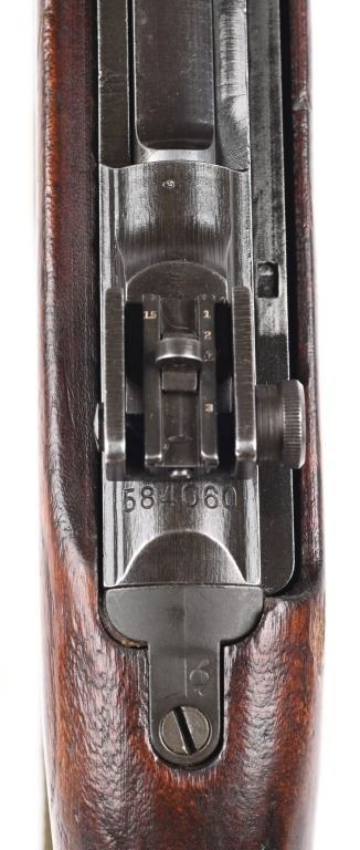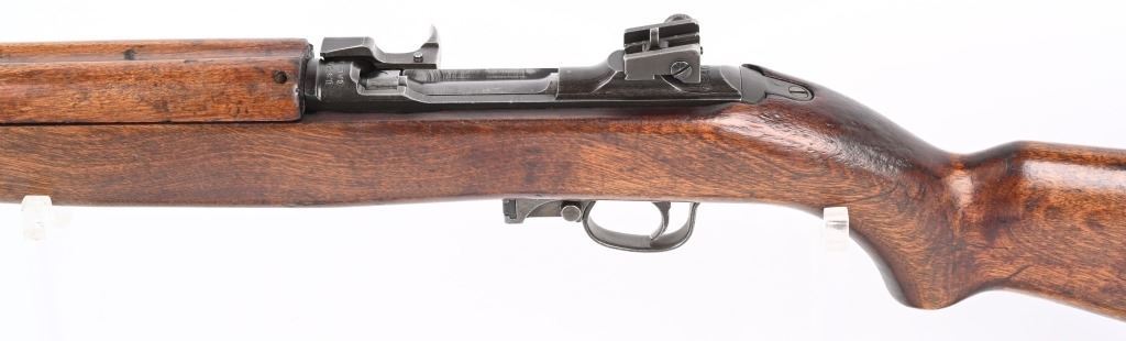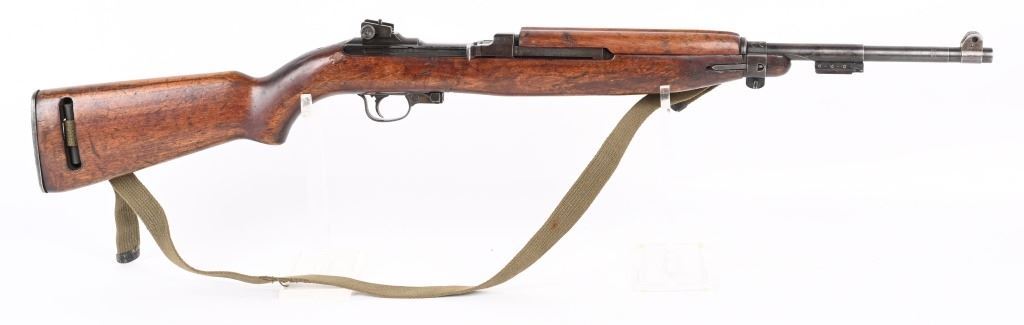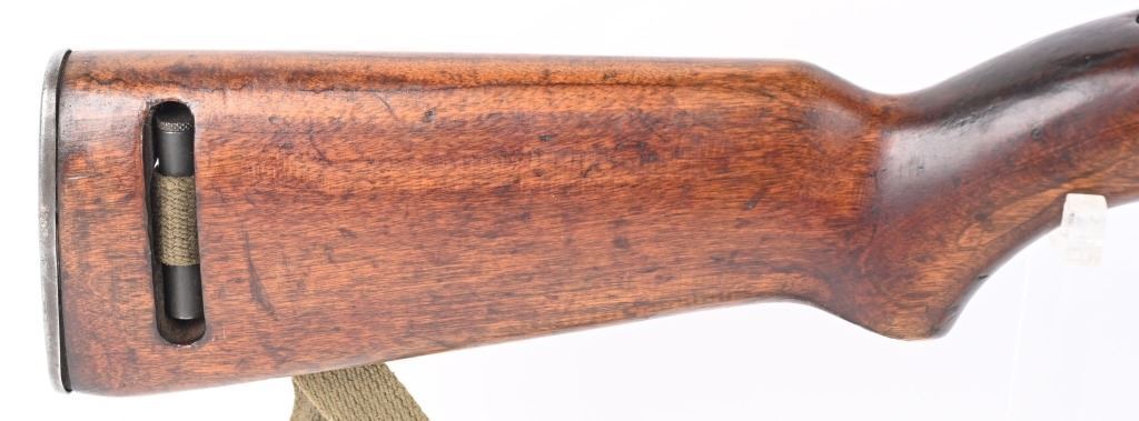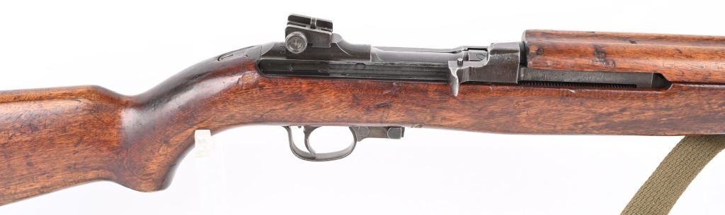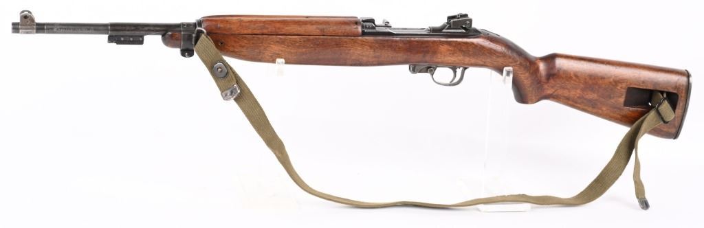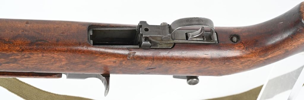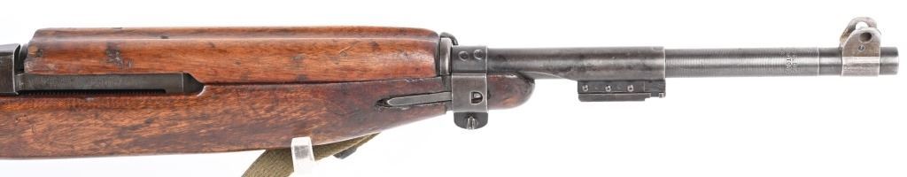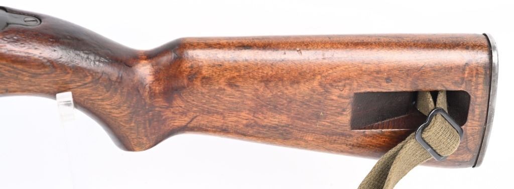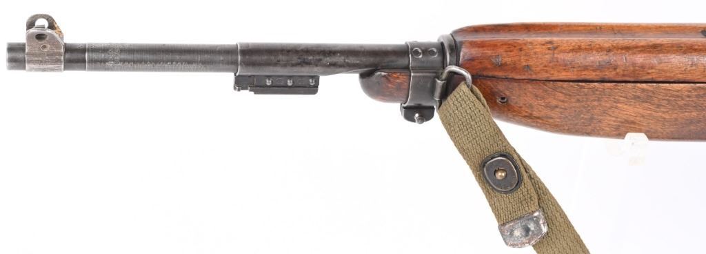 SERIAL NUMBER: 584060. BARREL: 18". CALIBER: .30 CARBINE. MANUFACTURED: 1943. Inland Division production barrel, dated "8-43". Blue Sky import mark on the left side of the barrel. Late production bayonet lug/band. Winchester slide. Saginaw bolt (flat). IBM trigger group. Sights are late war Inland production. Post war "Pot Belly" stock, being unmarked. Standard late war sights. Original parkerized finish. Wood has a light oil finish. Original sling (unmarked) and oiler. No magazine included. CONDITION: Metal is good overall, with general wear and light handling marks. Wood has minor scrapes, scratches and dents. Bore is shiny with crisp rifling. Fine mechanics. C&R