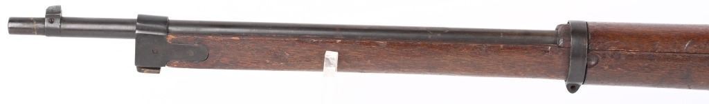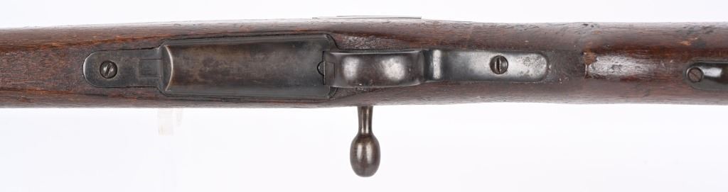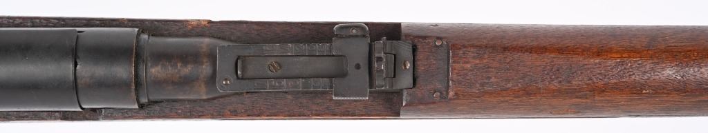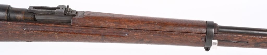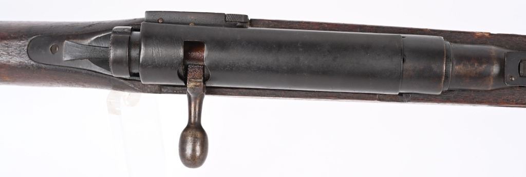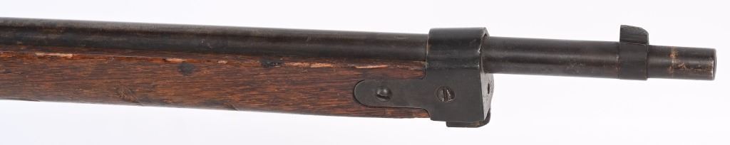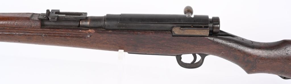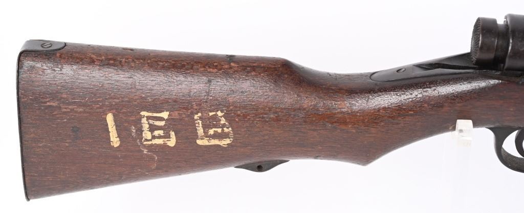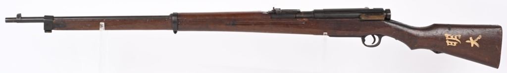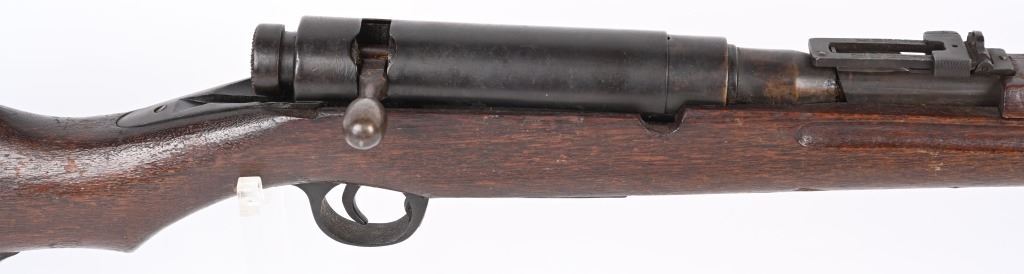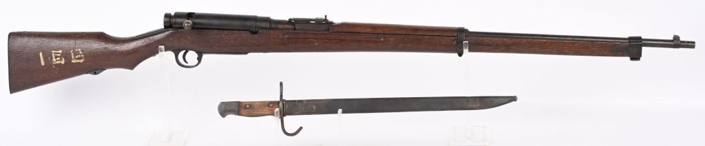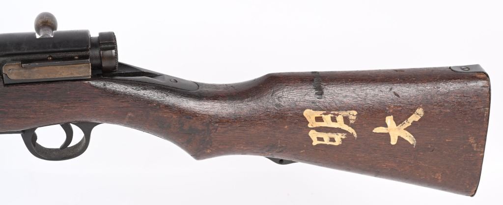 SERIAL NUMBER: A17. BARREL: 31-1/2". CALIBER: 6.5 BLANK. MANUFACTURED: 1940'S. Training rifle used in schools and army training to help ready combat recruits. No mum or model markings. No import marks as well. Only serial number is on the action. Blade front sight, with Type 38 style rear (on backwards). Military blued finish and oiled wood tock, with what look to be painted school markings on the right and left side. Attached original dust cover. Includes a training type bayonet/scabbard, with no makers marks on the blade. A serial number ("4657") on the left grip panel and markings exist on the left grip panel. Dulled blade. CONDITION: Metal is good overall, with general wear and brown patina. Wood has minor handling marks. scrapes and scratches. Bore is heavily frosted. Action has grease inside. Mechanically fine. NOT TO BE SHOT AS IT IS A TRAINING RIFLE. Bayonet has patina and cleaned surface rust on the scabbard. C&R