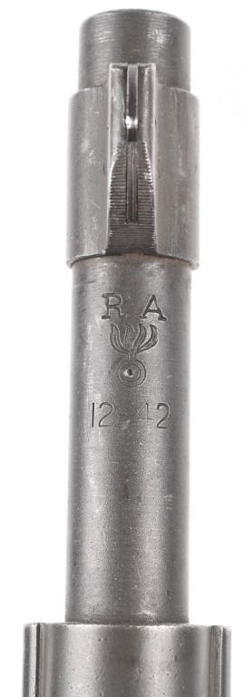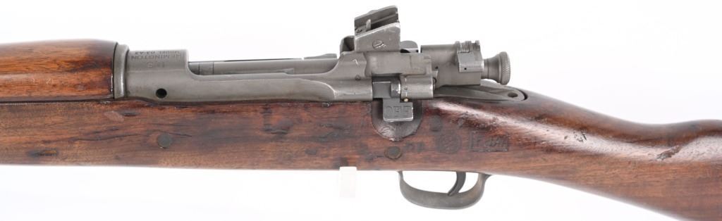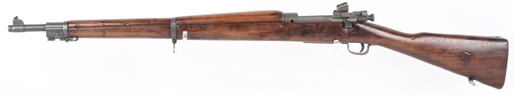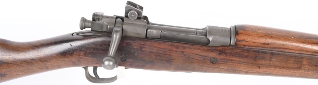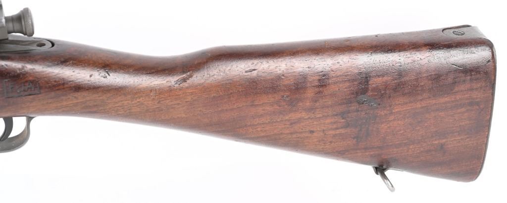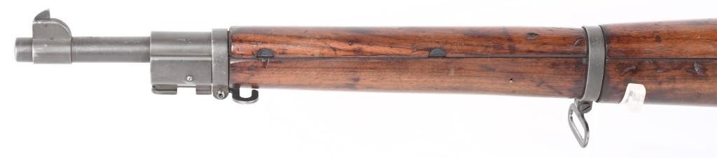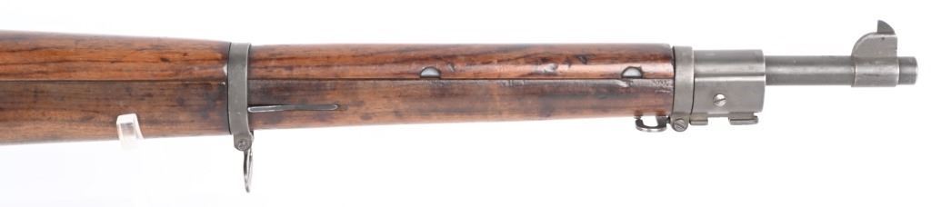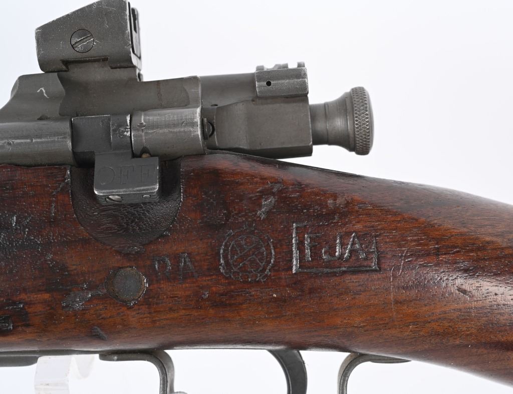 SERIAL NUMBER: 3358493. BARREL: 24". CALIBER: .30-06. MANUFACTURED: 1943. Made January of 1943. Barrel is Remington Production and is dated "12-43". Stock is Remington production, as are most of the small parts, being stamped with small "R"s. There is a crossed cannons cartouche on the left side of the stock, in addition to a boxed "FJA" inspectors stamp. Circled "P" firing proof on the bottom of the wrist. Standard blade front sight and adjustable peep rear. Parkerized finish. Oiled wood stock and hand guard. Checkered metal butt plate with trapdoor for butt plate. CONDITION: Metal is excellent overall, with a few handling marks. Wood has numerous scratches, dents and handling marks. Bore is clean overall, with strong four groove rifling. Mechanically fine. C&R