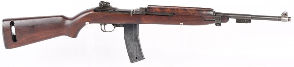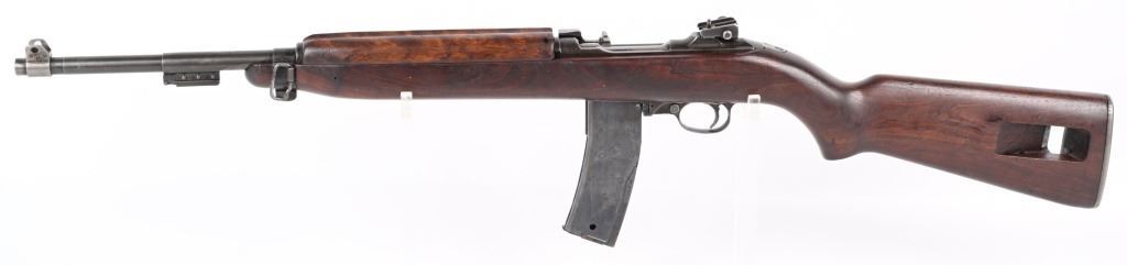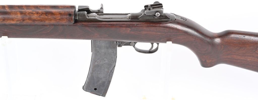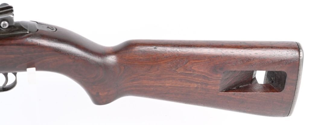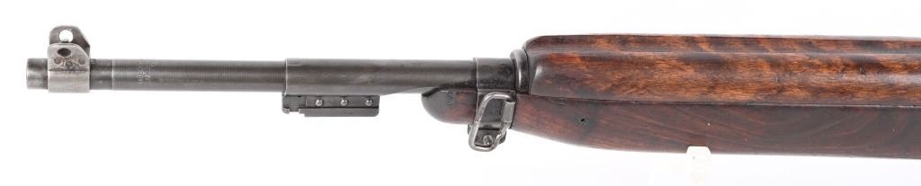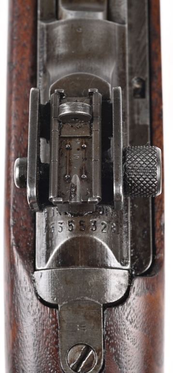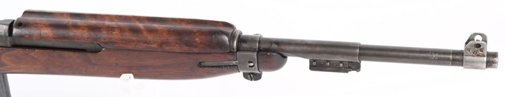 SERIAL NUMBER: 5355328. BARREL: 18". CALIBER: .30 CARBINE. MANUFACTURED: 1944. No import marks found. Barrel is Inland production and is dated "6-44". Trigger housing is unmarked. Slide is Standard products. Bolt is National Postal Meter. Recoil plate is Winchester. WW2 contractor bayonet lug/band. "IO" marked stock, which has a Standard Products stamp on the right side. There is a crossed cannons cartouche on the right side of the butt. Hand guard is IBM contractor production. Late War blade front sight and stamped adjustable rear. Original parkerized finish. Oiled wood stock. Includes a Seymour products 30 round magazine. CONDITION: Metal is good overall, with the parkerized finish wearing in most places. There are areas of dried grease around the action. Wood has handling marks, scrapes and scratches. Bore is shiny with crisp rifling. Magazine is excellent. C&R