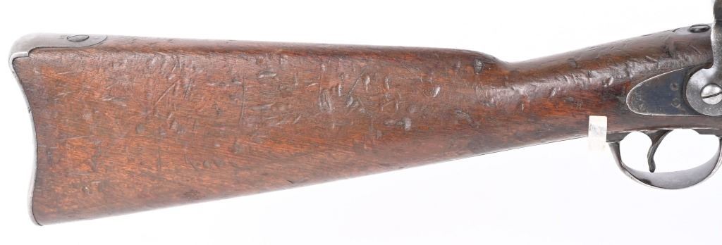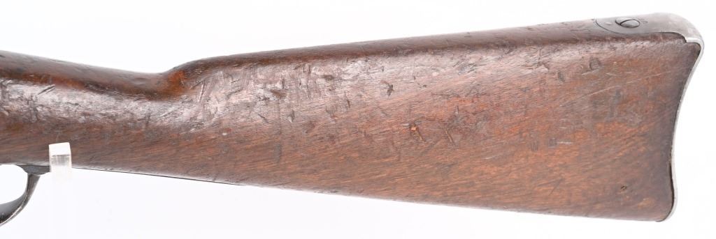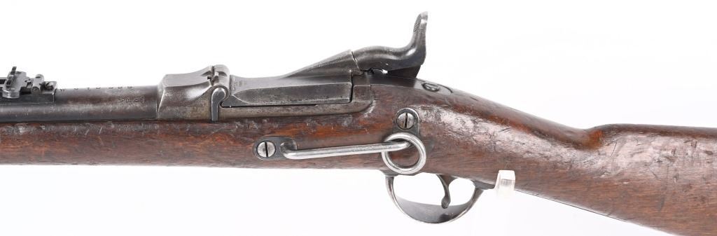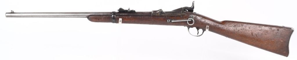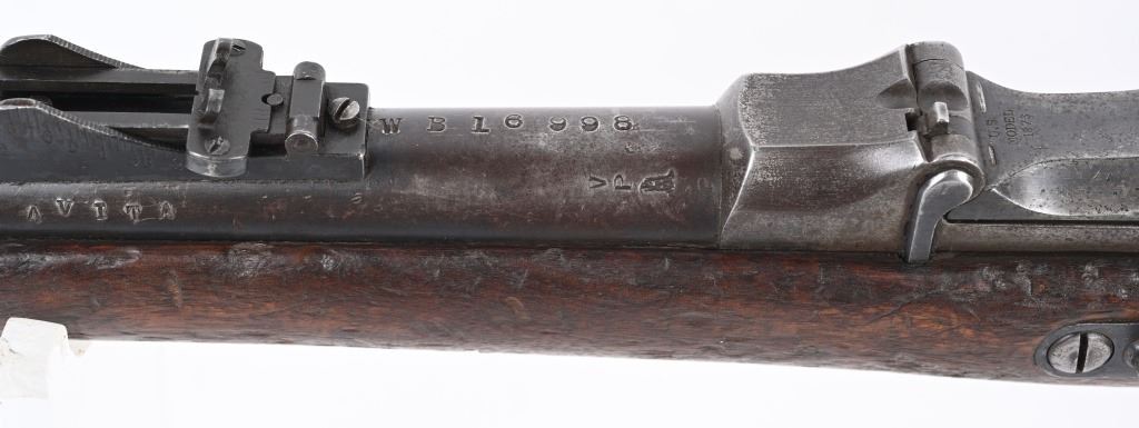 SERIAL 140746. BARREL 22". CALIBER 45-70. Barrel has Warner Brothers inventory stamp " WB16998 ". Has 1873 Carbine stamped rear sight, single band, walnut stock. Lock is stamped US SPRINGFIELD with eagle. Block is stamped "US MODEL 1873". Barrel has VP proofs and is stamped "Avita". No visible cartouche stamps on stocks. Stock has a WB stamp. Sling swivel removed from butt. Condition: Metal is patina. Stocks have numerous dings. Bore is sharp with some residue. ANTIQUE