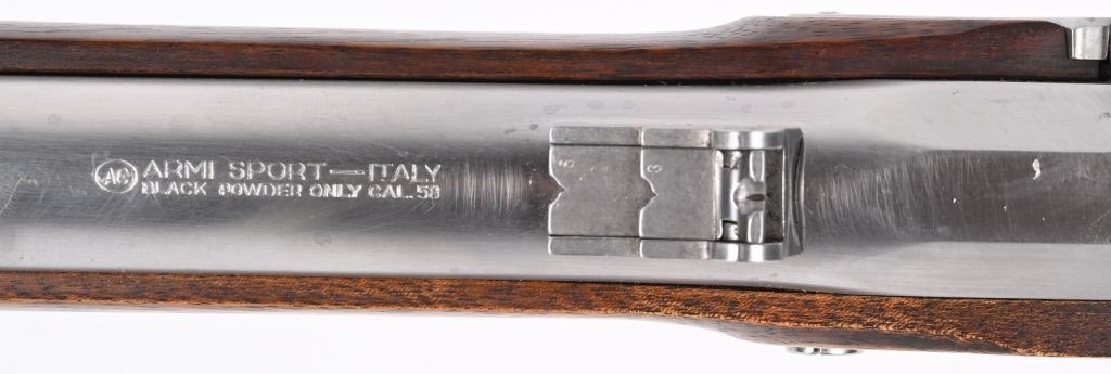 SERIAL S16123. BARREL 40". CALIBER .58. MFG BY ARMI. Faithful replica of an 1861 rifle. Metal finished in the white, 3-band, iron ramrod, full length walnut stock, sling swivels. Lock and barrel dated 1861. Condition. Looks to be near mint with light handling. NO FFL