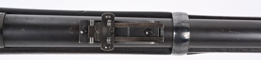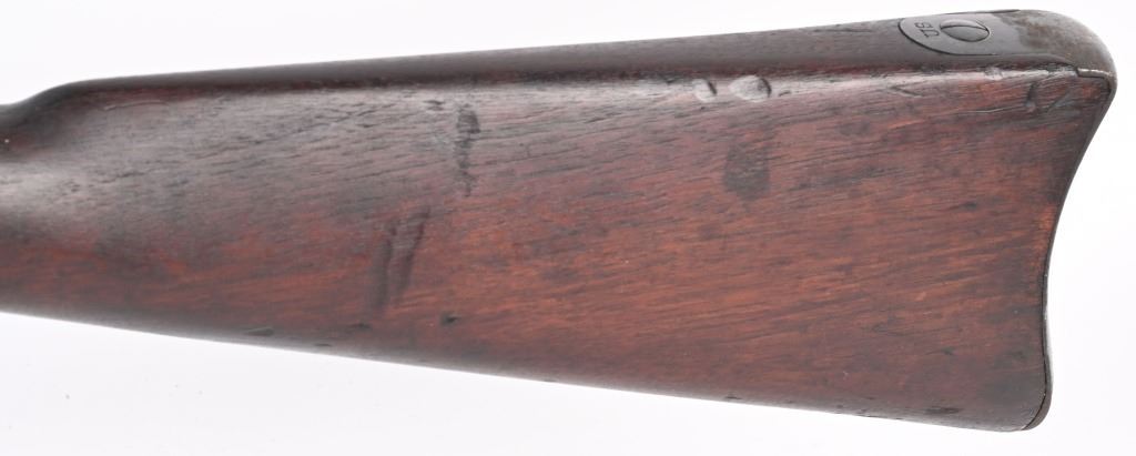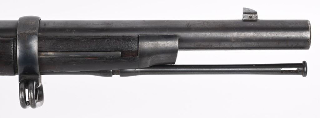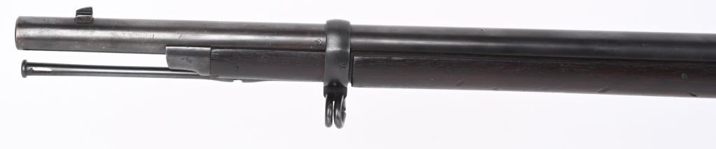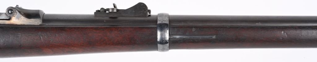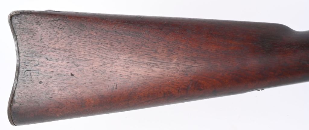 SERIAL 368730. BARREL 32 5/8". CALIBER 45-70. MADE IN 1887. Standard features include full length walnut stock, Rifle stamped rear sight, two bands, sling swivels, steel ramrod. Left side of barrel stamped NJ with eagle proofs. Block stamped US Model 1873. with US SPRINGFIELD & eagle stamped lock. Condition. 90% dulling blue on barrel with scattered handling marks. Stock is excellent with several dents and impressions but no government inspector cartouche stamps. Mirror bright bore. ANTIQUE