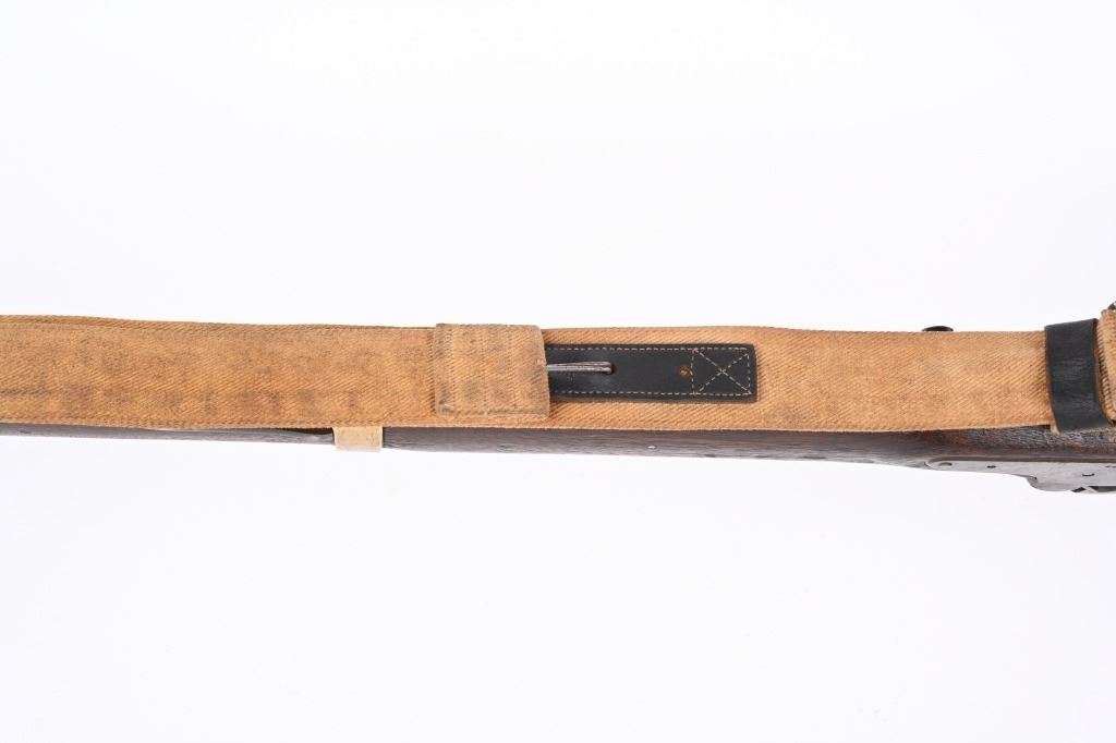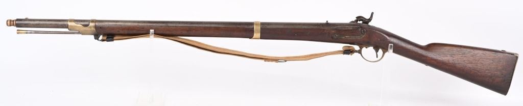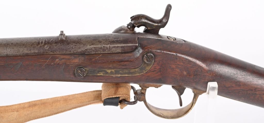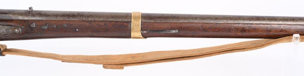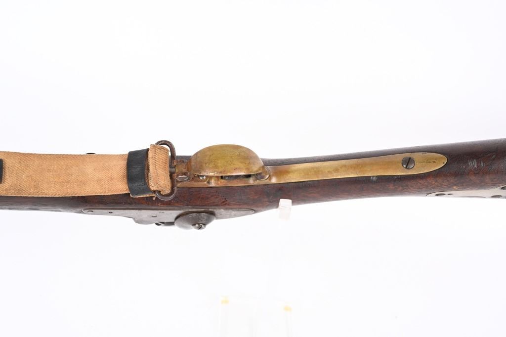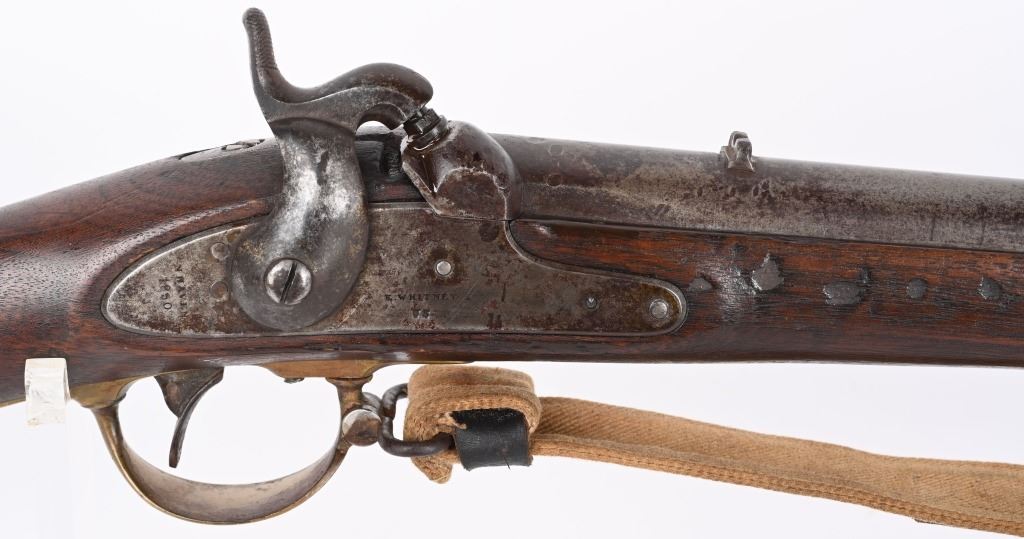 BARREL 33". CALIBER 54. Lock stamped E.WHITNEY US N. HAVEN 1850. Features brass furniture to include 2-bands, guard, butt plate and patch box. Walnut stock with steel ramrod and comes with an old canvas sling. Condition. Hammer cocks and works but spongy. Stock has usual small dents and scratches with repair on right side. Brass has toned. Iron is patina. Legends are good. Bore is crisp with minor residue. ANTIQUE