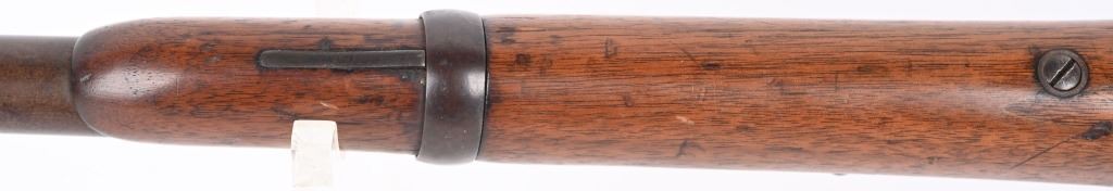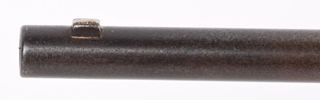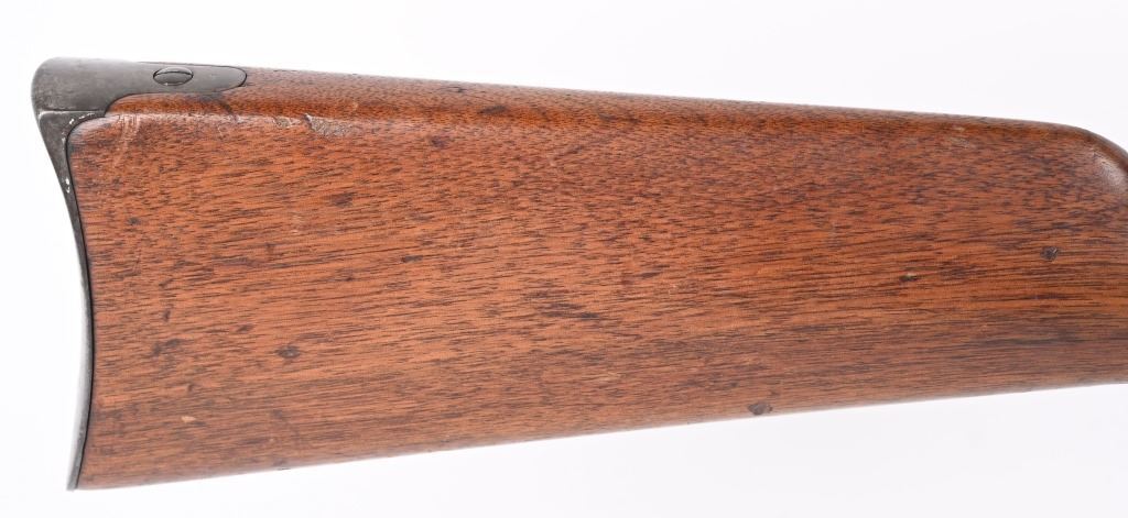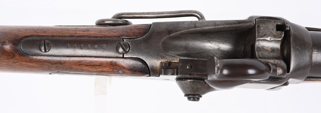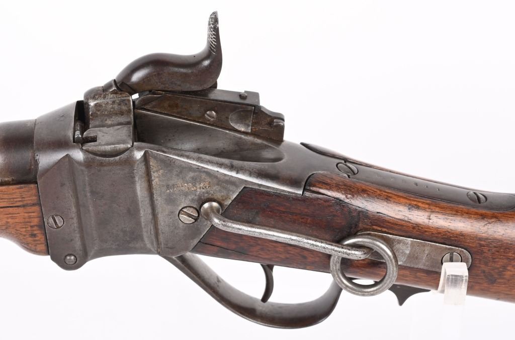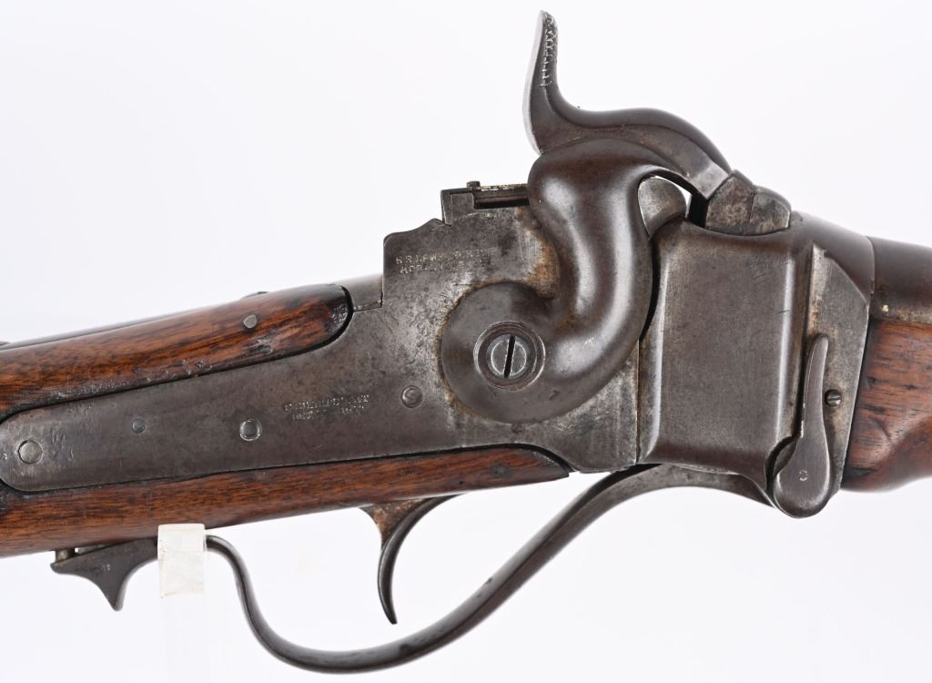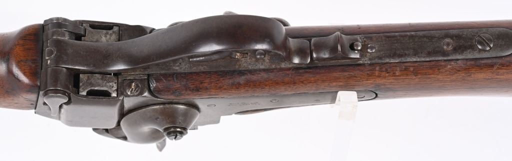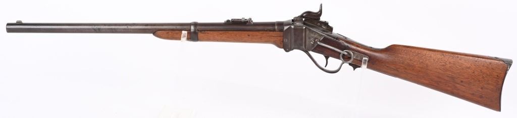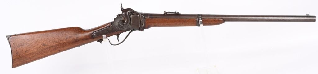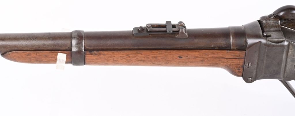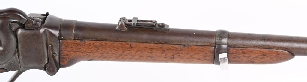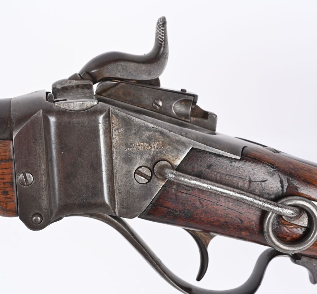 SERIAL C25811. BARREL 22". CALIBER 50-70 Indian Wars era post civil war conversion to 50-70 CF features single band, Lawrence rear sight, saddle ring & bar, walnut stocks. Sharps patents on both sides of frame. Condition. Metal is soft patina with light vise marks on breech of barrel. Stocks are excellent but no visible cartouche. Tang is cracked with a repair and there are a few hairlines on left side of stock and one on fore-arm. Rifling is strong and clean. ANTIQUE