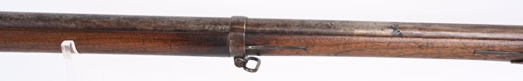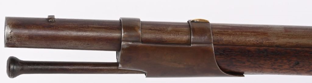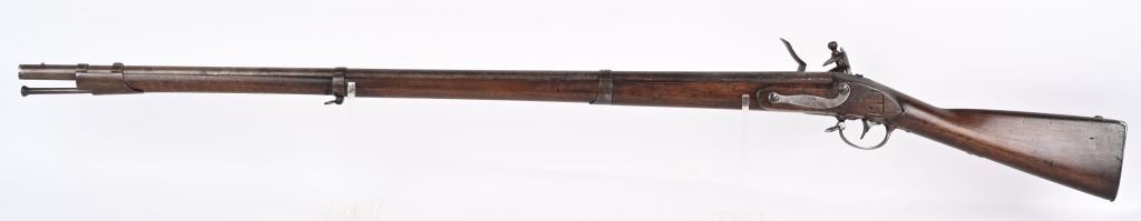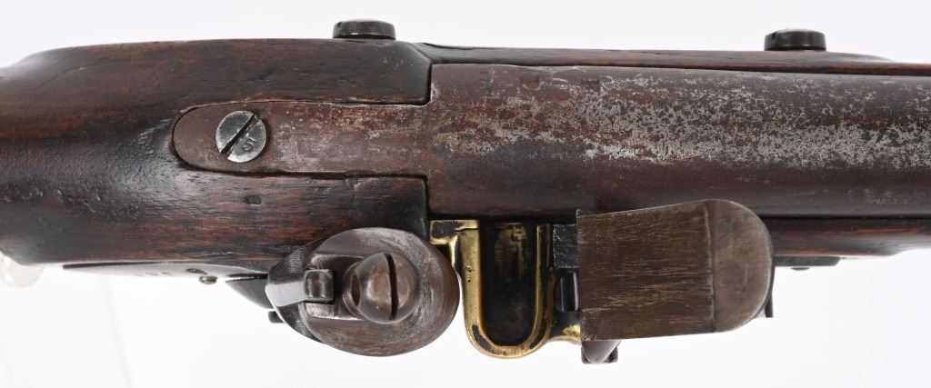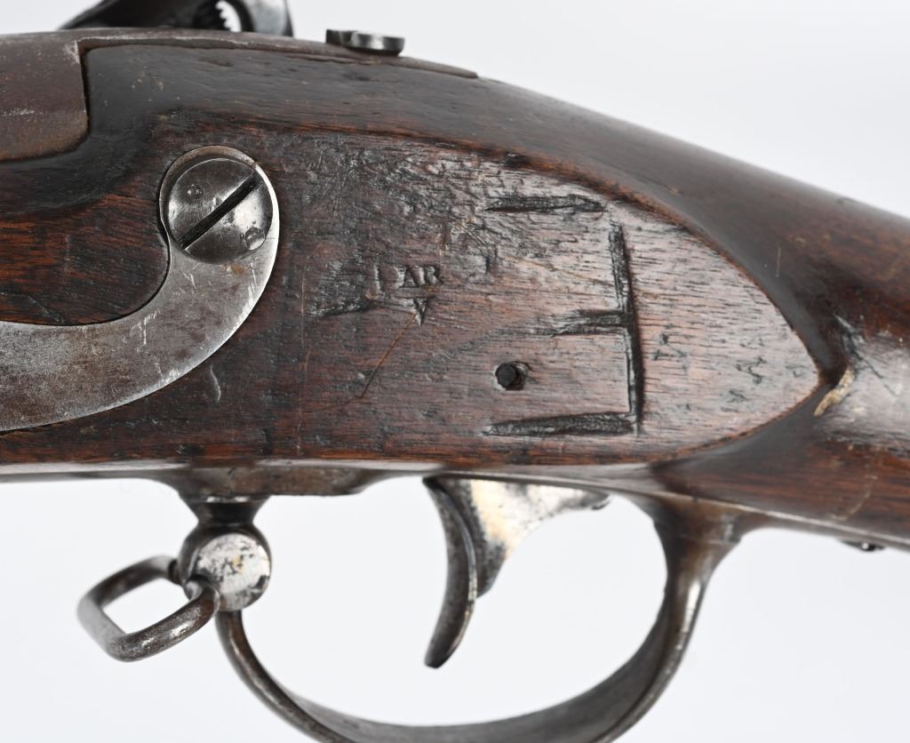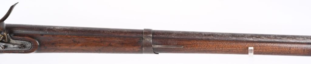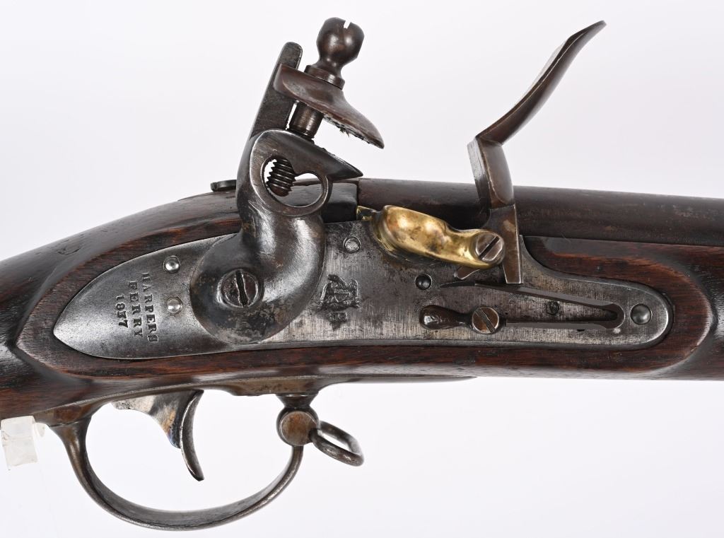 BARREL 42". CALIBER 69. This example was made at Harpers Ferry in 1837, and is so stamped on lock with US & eagle. Proof marks stamped on left side of barrel at breech. All iron mountings to include 3-bands, sling swivels, no barrel rear sight, iron ramrod, and full length walnut stock. Condition. Small repaired crack on left side at breech, , otherwise excellent stock with cartouche stamp on left side. Metal is smooth patina. Fairly clean bore. Nice example that was well cared for. ANTIQUE
