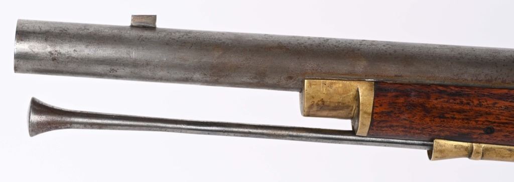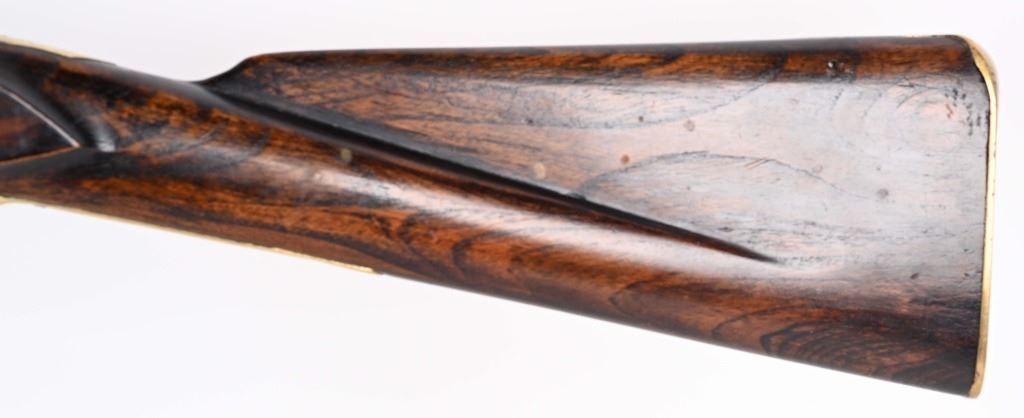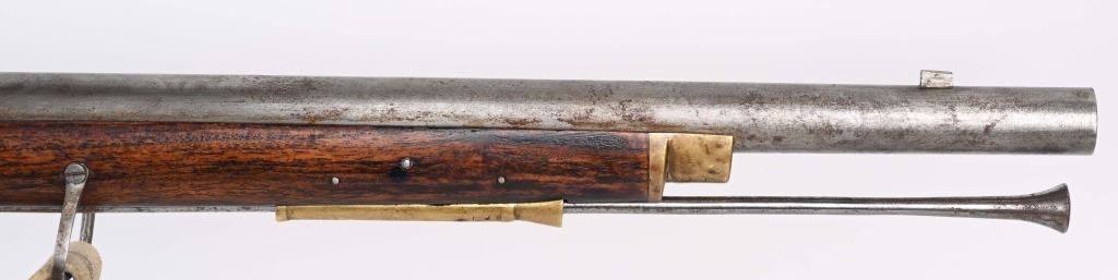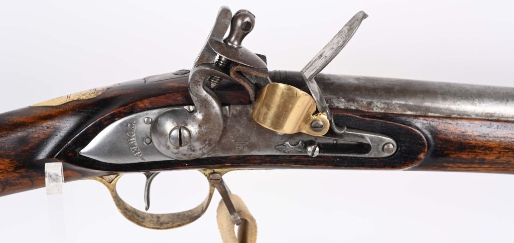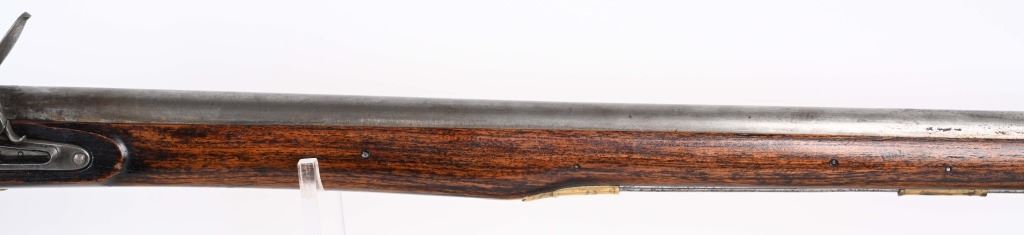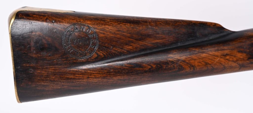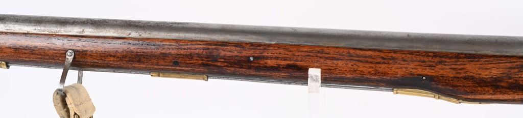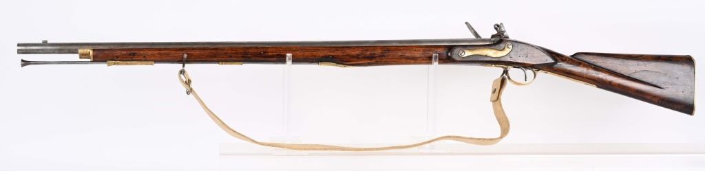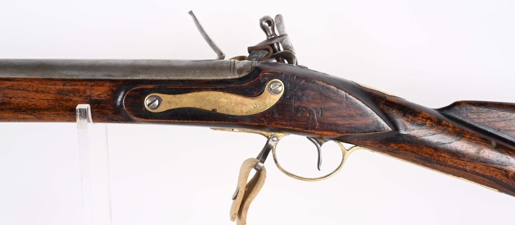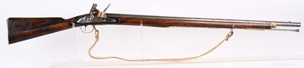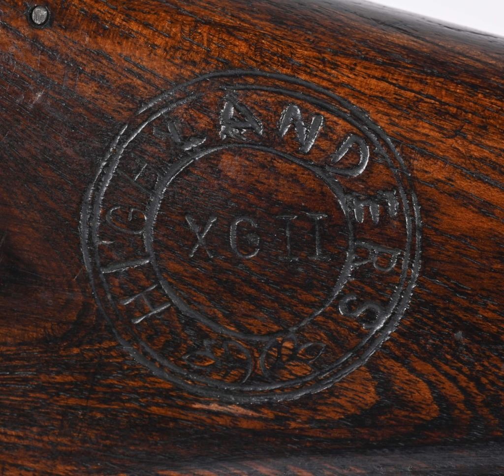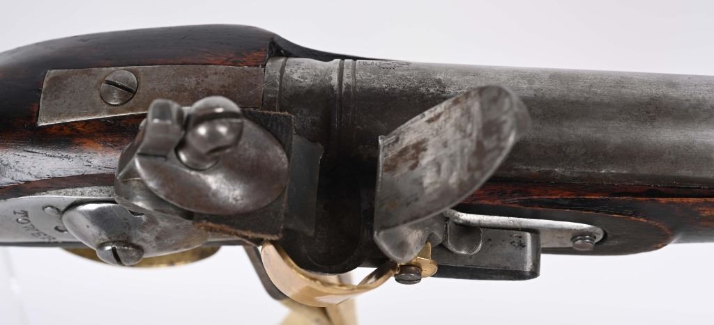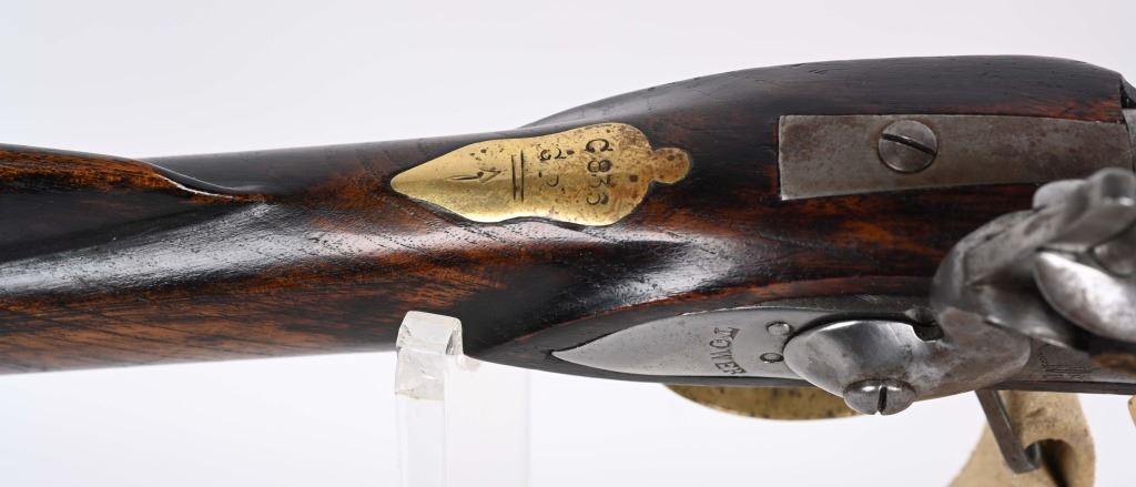 SERIAL NUMBER: C836. BARREL: 36". CALIBER: .73 CAL. MANUACTURED: 20TH CENTURY. Most likely made in Japan, but no affirmative markings are present. "TOWER" marked on the lock. "crown/GR" marked on the lock as well. "HIGHLANDERS" cartouche on the right side of the butt stock. Barrel has a bright finish, as does the lock. Brass stock parts and blast shield. Stock has a light oil finish. Includes attached reproduction sling. CONDITION: Metal is good overall, with general wear and some light brown patina forming. Wood is excellent overall. Clean, unrifled bore. Tight hammer. Flint is like new. BLACKPOWDER