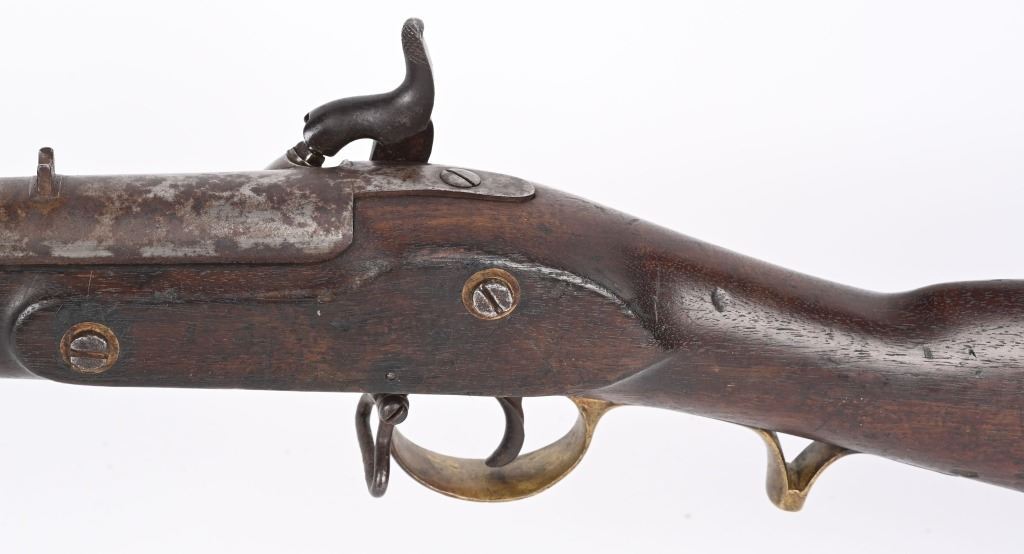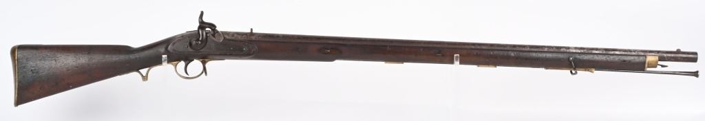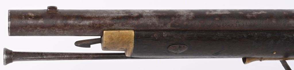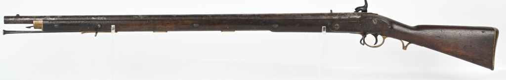 BARREL 39. 69 SMOOTHBORE. Lock is stamped with standing Lion. Right side of stock has a cartouche. Left side of barrel has British proofs. Features brass furniture, full length walnut stock, rifling has been bored out, brass trigger guard has numerous markings. No barrel bands. Sling swivels. Condition. Metal is now all patina. Bore is fairly clean. Legends are sharp. Stock is very good. ANTIQUE