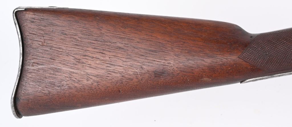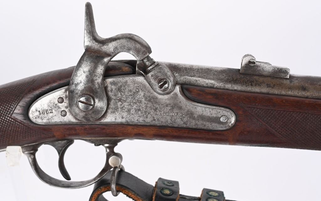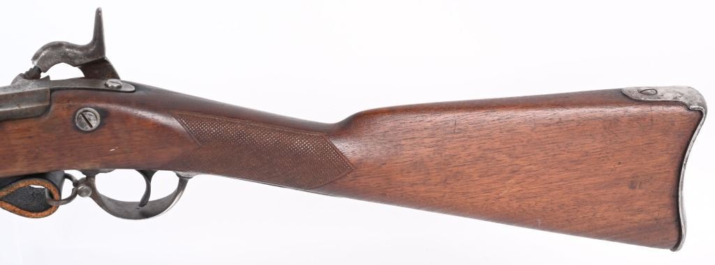 BARREL 40". CALIBER 58. Contract to Alfred Jenks & Son Bridesburg Penn, largest contractor for the pattern 1861 Springfield. Lock is stamped with 1862 date, US BRIDESBURG and eagle. VP proof on left side of barrel at breech. Features 3-bands, 2 leaf rear sight, metal ramrod, full length walnut stock and sling swivels. The wrist and fore-arm have been checkered (not factory) and there is a reproduction sling attached. Condition Metal which was finished in the white is not a smooth patina with usual light corrosion at barrel breech Wood is excellent. Rifling is still visible but some corrosion. ANTIQUE