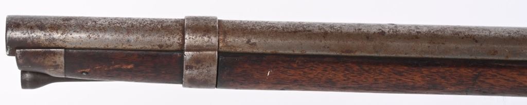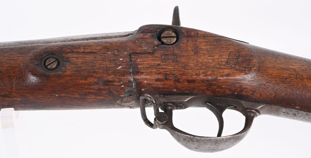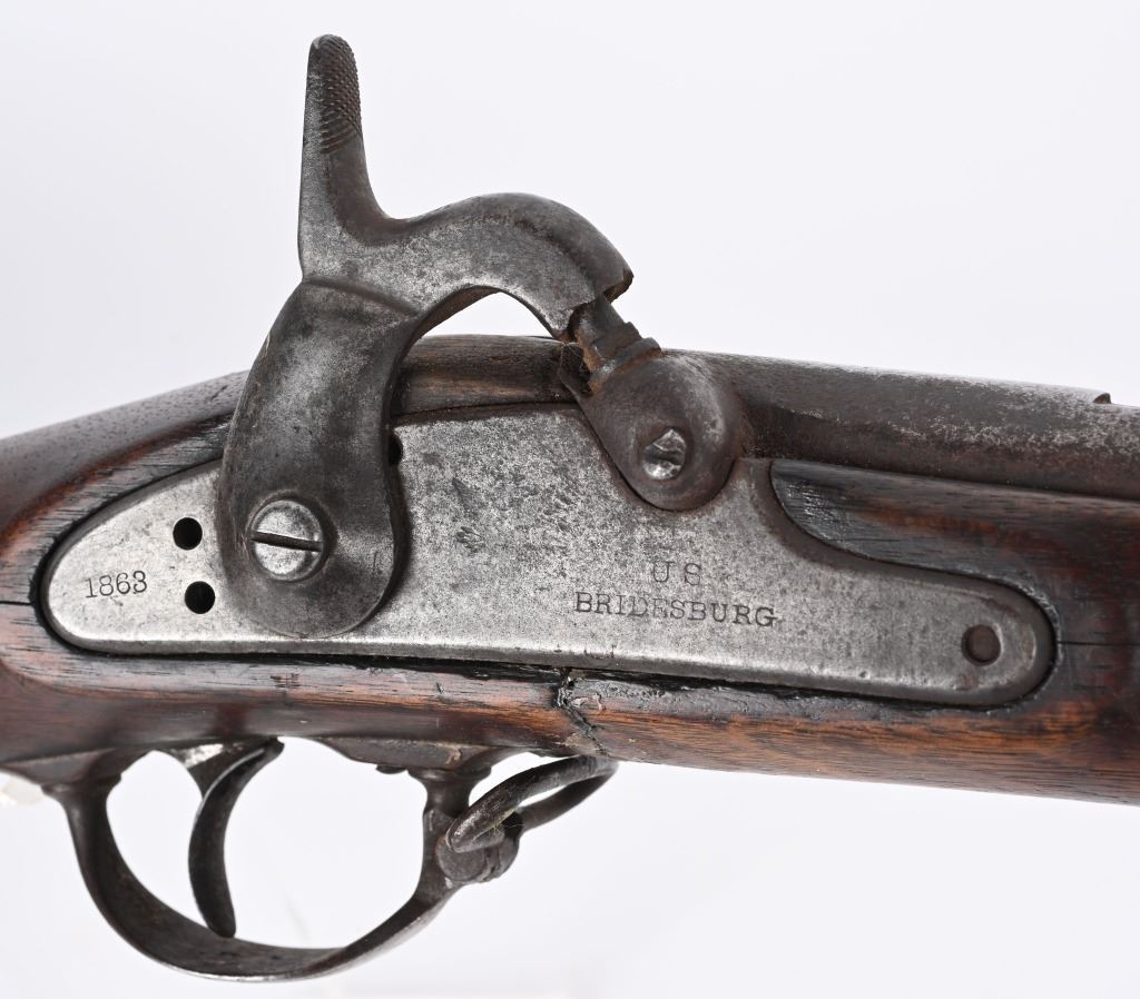 BARREL 37" CALIBER .58. . Lock is stamped "US BRIDESBURG" dated "1863" with eagle. Features 3-bands, missing rear sight, sling swivels, full length walnut stock with metal ramrod. Condition. Barrel shortened. Wood has crack at wrist along with nail repair. Visible, but not readable stock cartouche on left side. Metal was finished in the white and is now toned. ANTIQUE