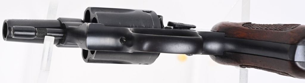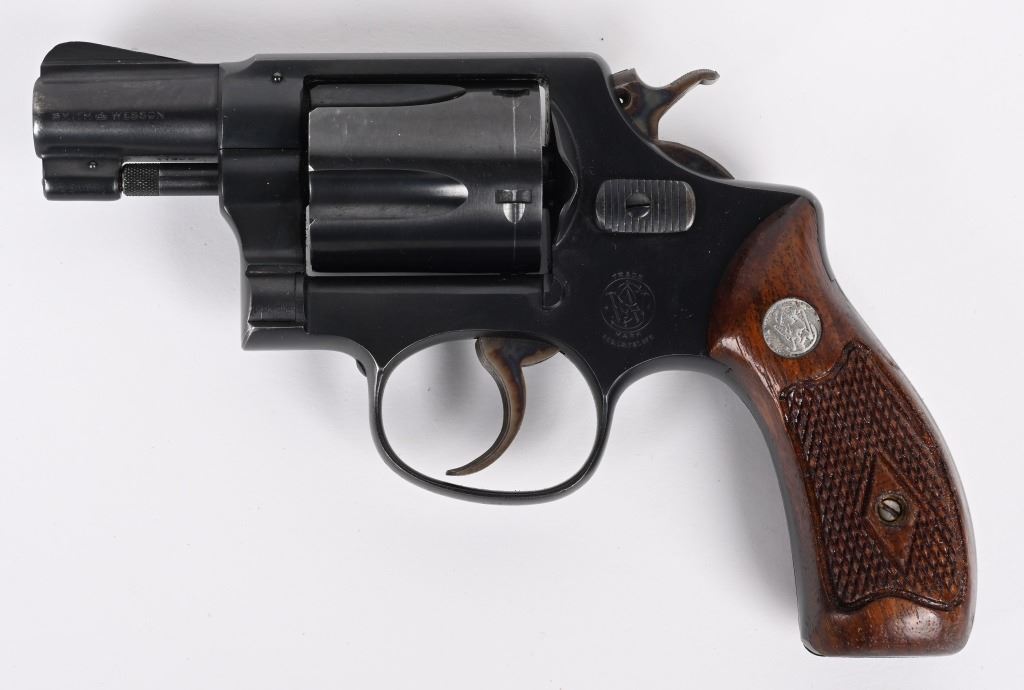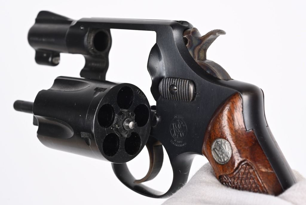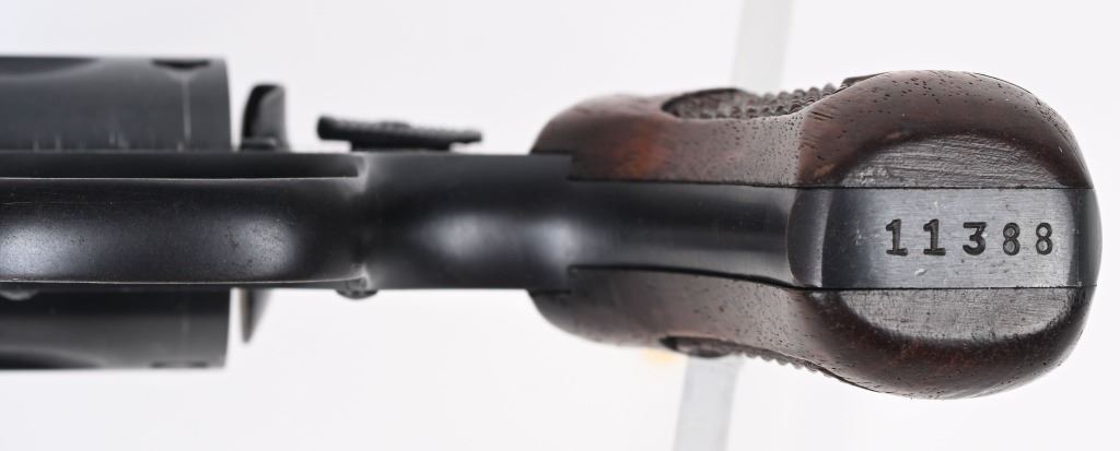 SERIAL 11388. BARREL 1 7/8". CALIBER .38 SPECIAL MADE FROM 1950-57. Built on the round butt J frame, 5-screw, flat latch, blue finish, case color hammer & trigger, diamond checkered walnut grips, fixed sights. 5-shot double action. Condition. Grips are near mint but numbered to different gun. Otherwise, just a drag line and few handling marks. Near mint with fine bore and action. C&R