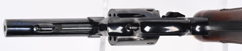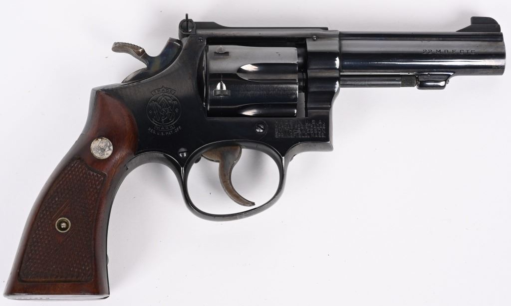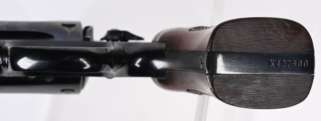 SERIAL K427600. BARREL 3 3/4". CALIBER .22 MAGNUM MADE IN 1960. Referred to as the K-22 Masterpiece Magnum Rimfire first offered in 1959. Built on the square butt K-frame, 4-screw, with pinned barrel and recessed chambers. Features target rear sight, patridge front sight, wide spur case color hammer with case color trigger. Diamond checkered walnut grips are numbered to the gun on right panel. Condition. Barrel was professionally shortened. Gun retains 99% blue with excellent grips and fine bore & action. C&R