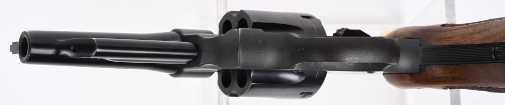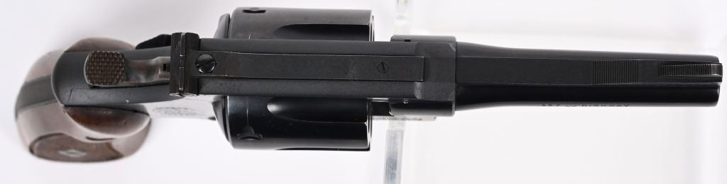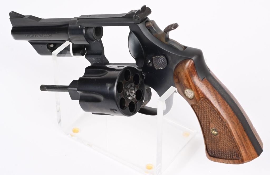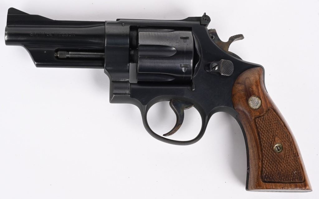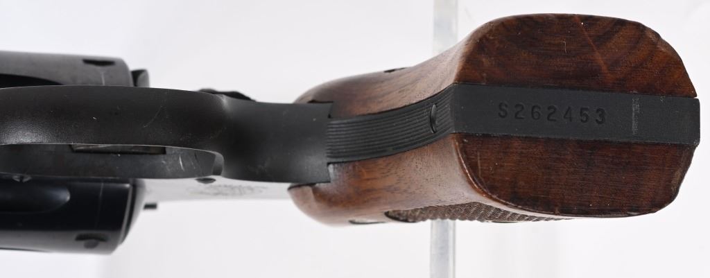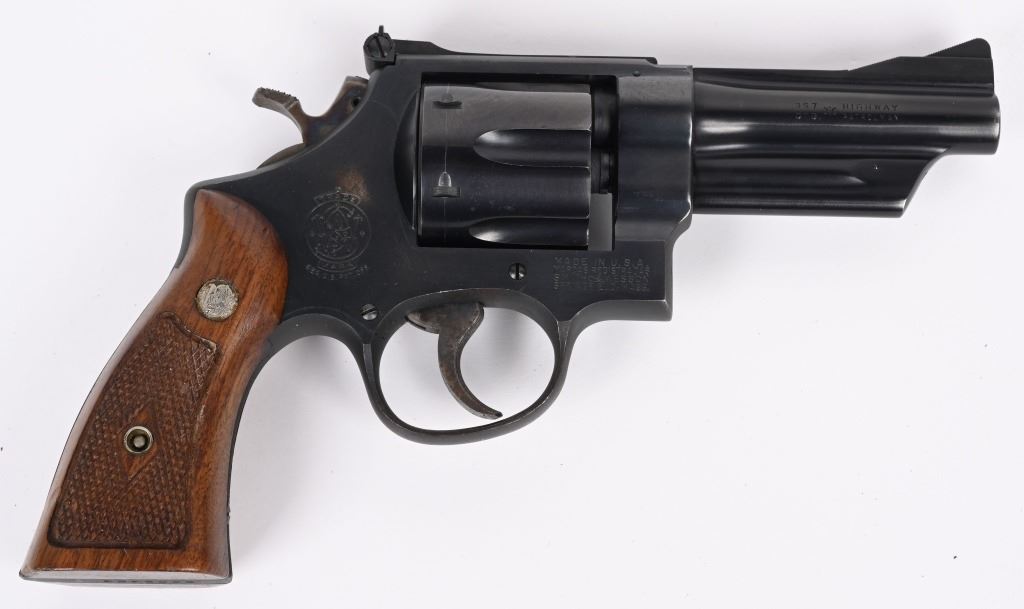 SERIAL S282453. BARREL 4". CALIBER .357 MAGNUM. MADE 1966-67. Built on the square butt N-frame, 3-screw with pinned barrel, blue finish, case color hammer & trigger, adjustable rear sight and checkered diamond walnut grips. Condition. 98% with a hint of muzzle wear, light drag line and one small patina spot on right side of frame. Fine bore and action. C&R