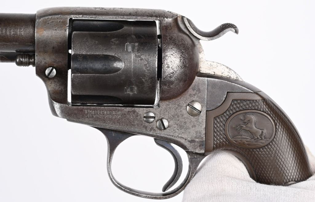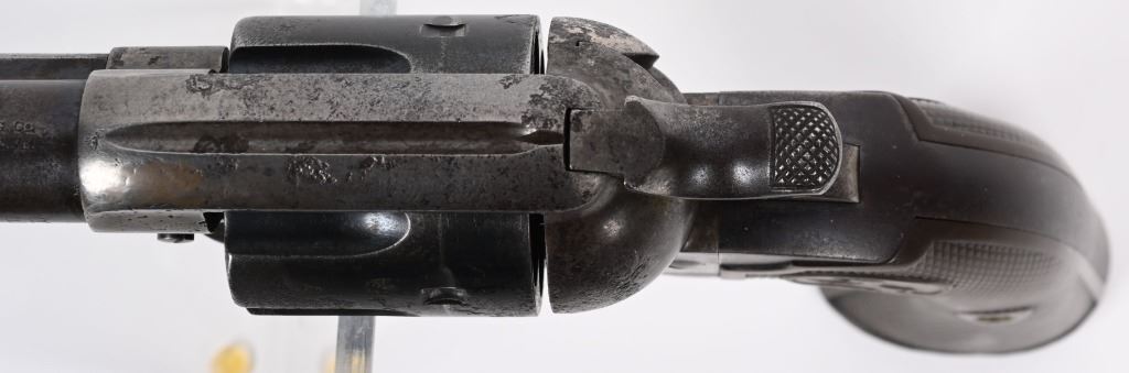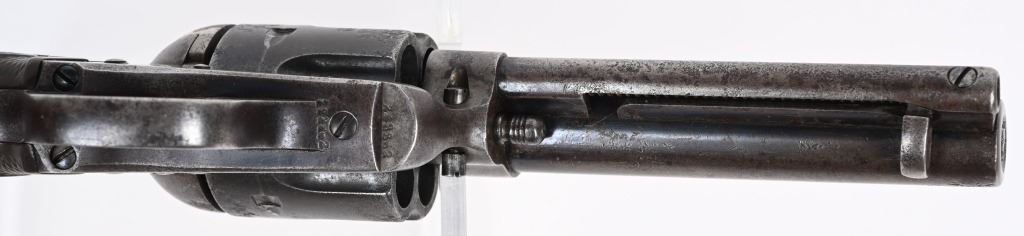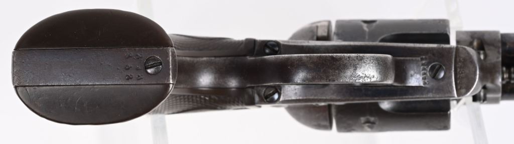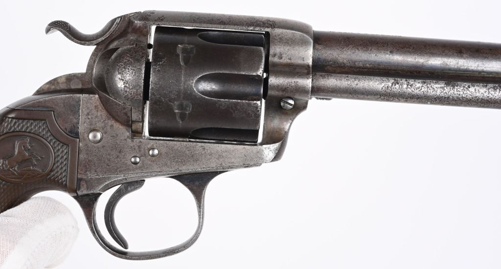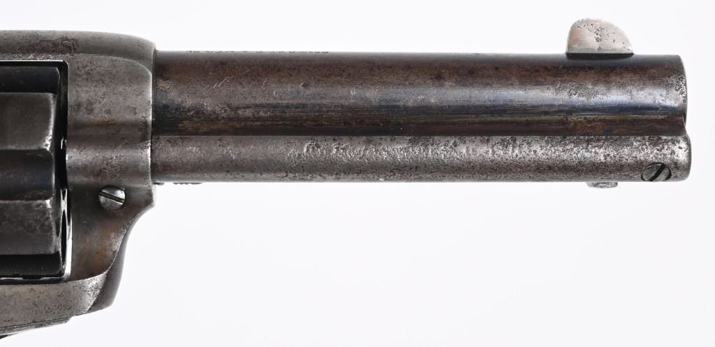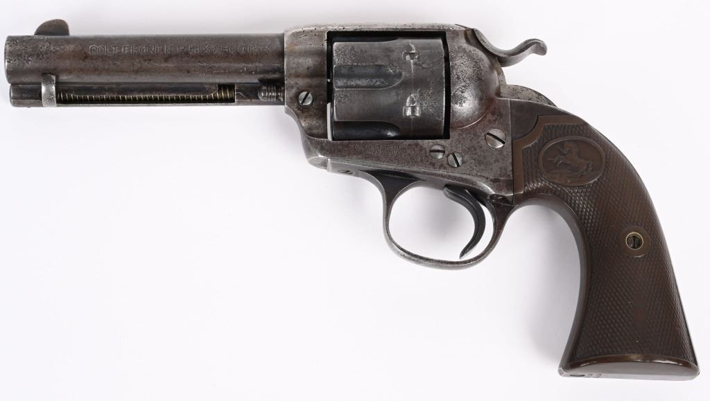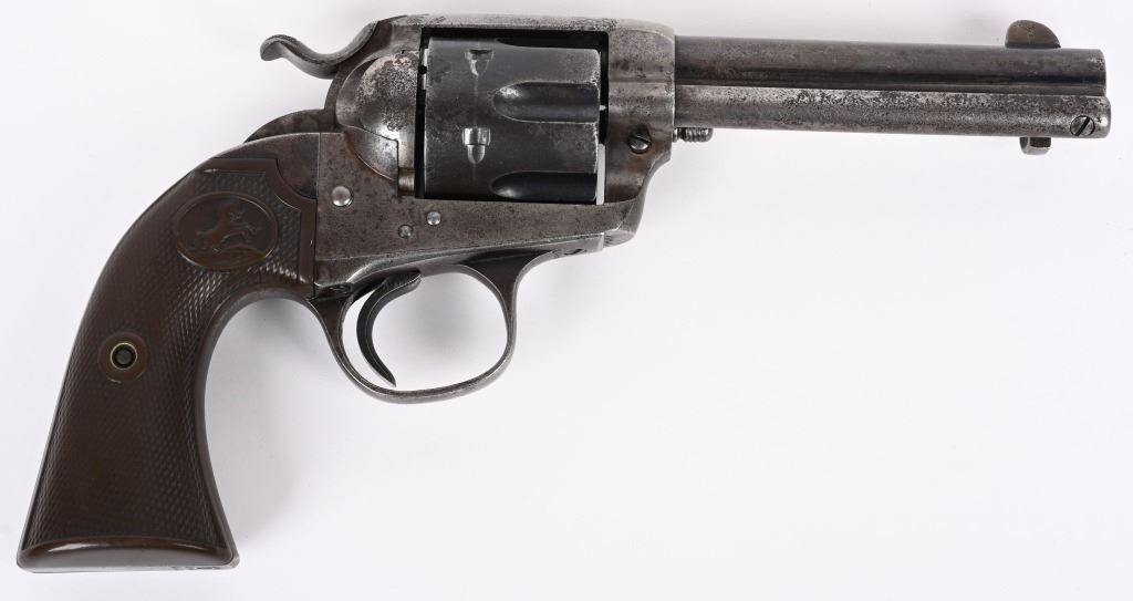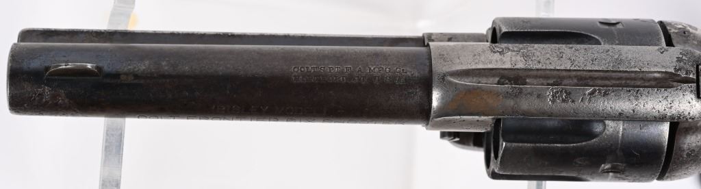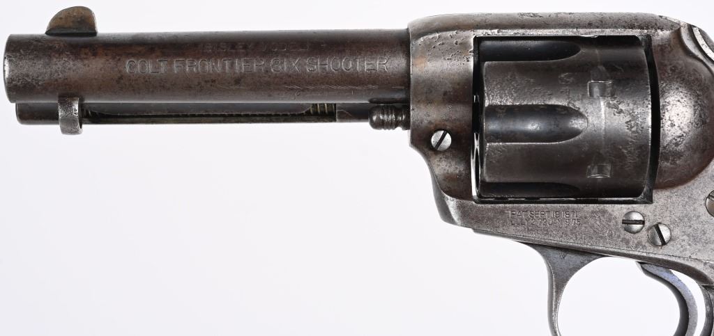 SERIAL 293862. BARREL 4 3/4. CALIBER 44-40. MADE IN 1907. Barrel stamped BISLEY MODEL COLT FRONTIER SIX SHOOTER. Standard blue and case color finish, gutta percha Bisley grips. Condition. Basically no original finish, some scattered pitting, very good grips with no chips or cracks. Rifling is strong and action functions correctly. C&R