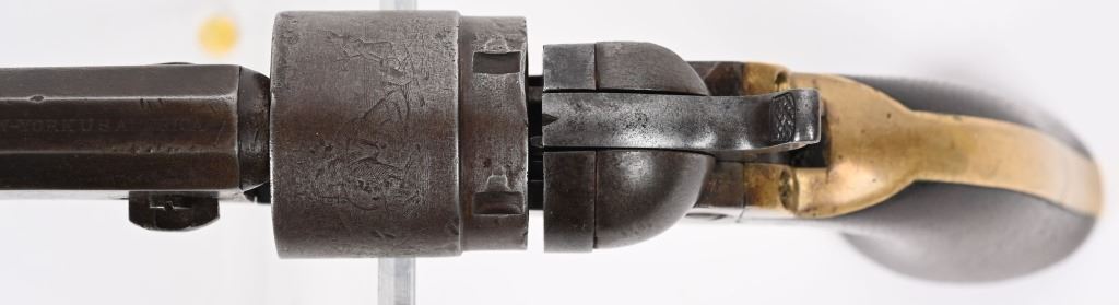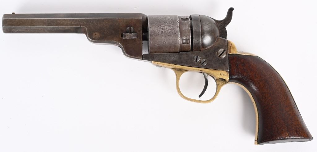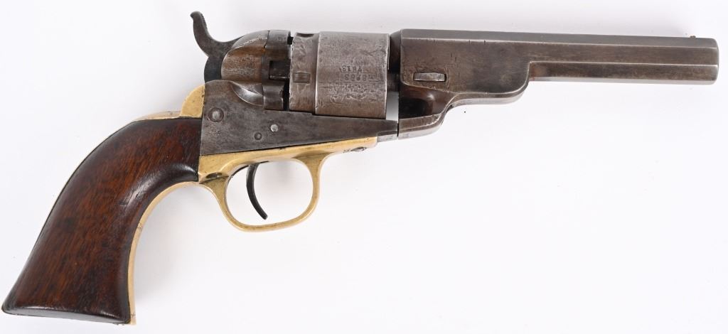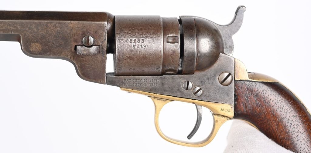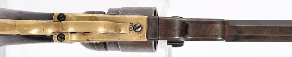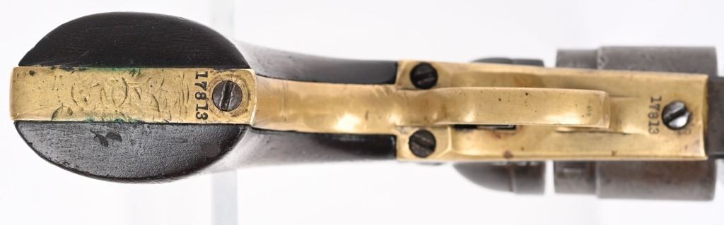SERIAL 17813. BARREL 4 1/2". CALIBER 38RF. MADE 1873-75. About 2000 of these were manufactured. All matching numbers features octagon barrel, no ejector, brass frame, one piece walnut grips in blue & case colors. Rebated cylinder has the stage coach scene. Condition. Smooth homogenous patina. 70% cylinder scene, excellent grips, brass has toned. legends are sharp. Fine bore and action. ANTIQUE