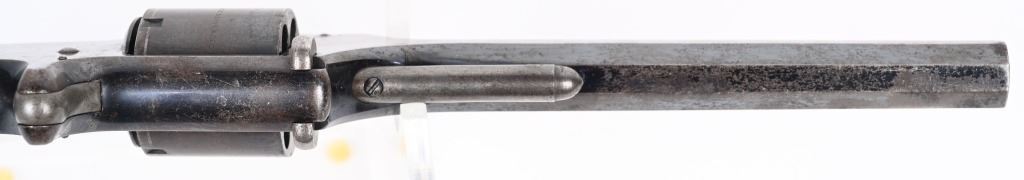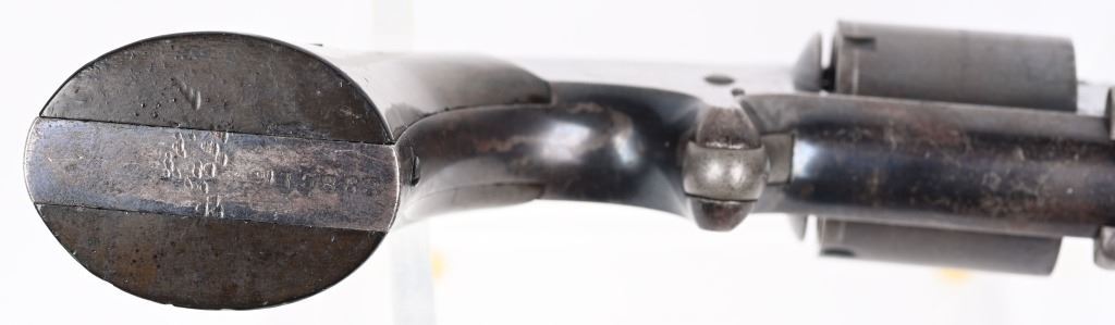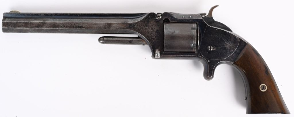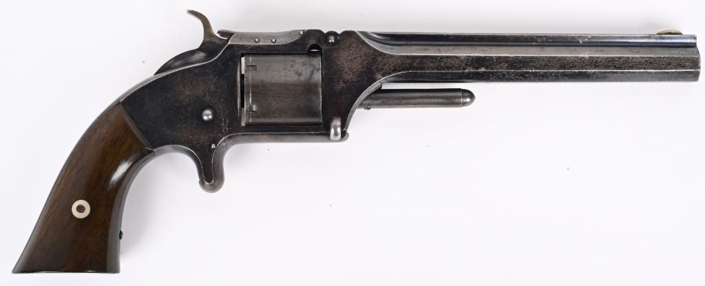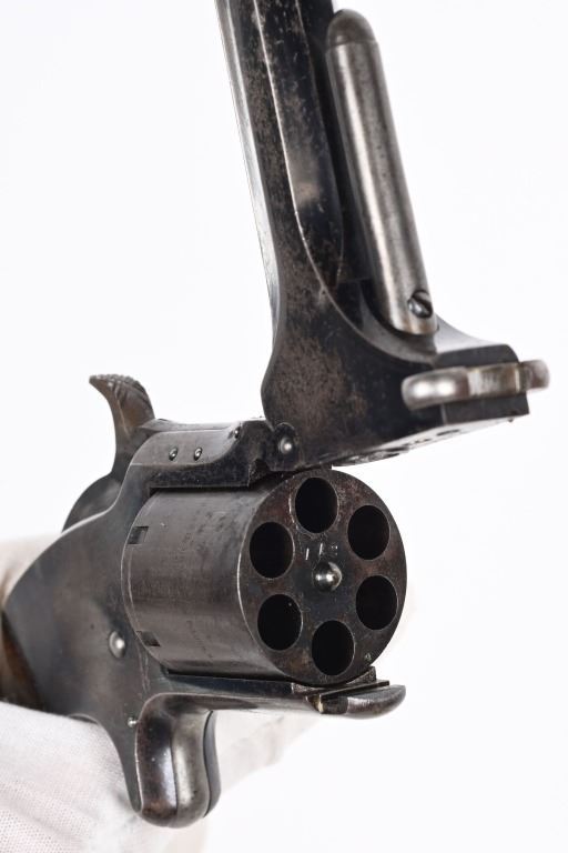 SERIAL 15863. BARREL 6". CALIBER 32 RF LONG. 1861-74. This early serial number is in Civil War range. Features the high polish blue finish, address on barrel rib, case color hammer, rosewood grips. Condition. Very fine overall with at least 40-50?% blue, excellent grips, sharp clean bore, indexes and locks up like new. Very clean example. ANTIQUE