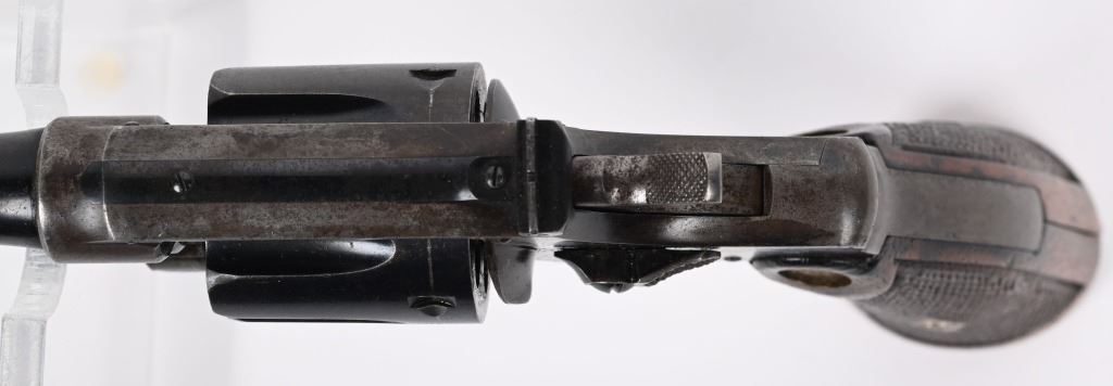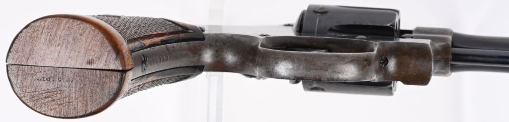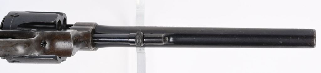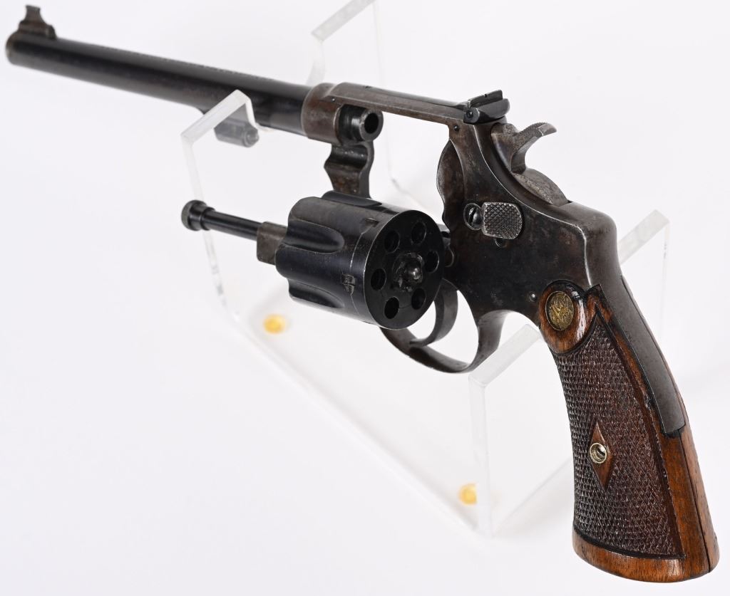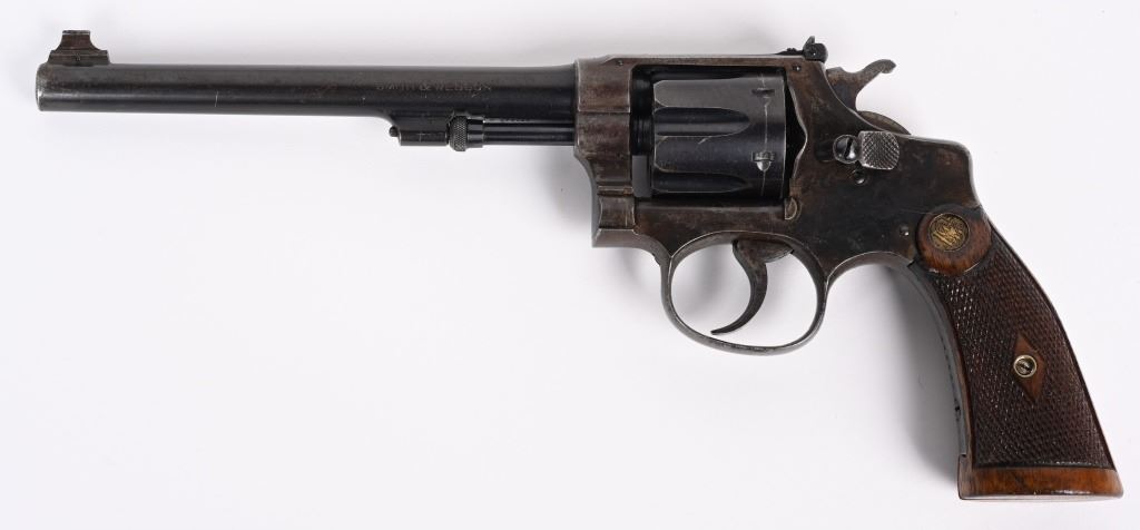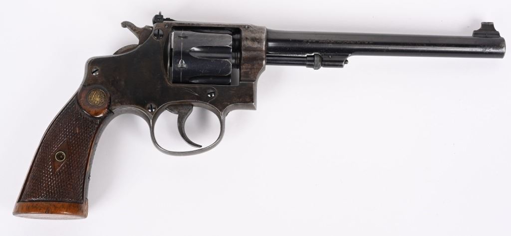SERIAL 279690. BARREL 6". CALIBER .22 LR. Built on I-frame, round butt, 5-screw, pinned barrel. Features a patridge front sight, target rear sight, single screw diamond checkered walnut grips, blue finish, case color hammer & trigger. Matching numbers included pencil number in grips. CONDITION. Frame is blue brown patina with flashes of blue. Barrel retains 85% blue. Grips are very good. C&R