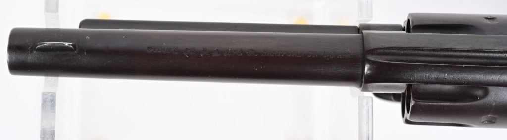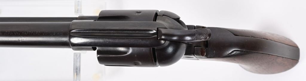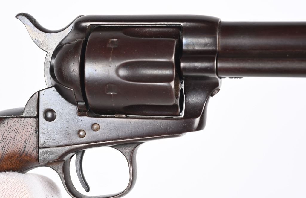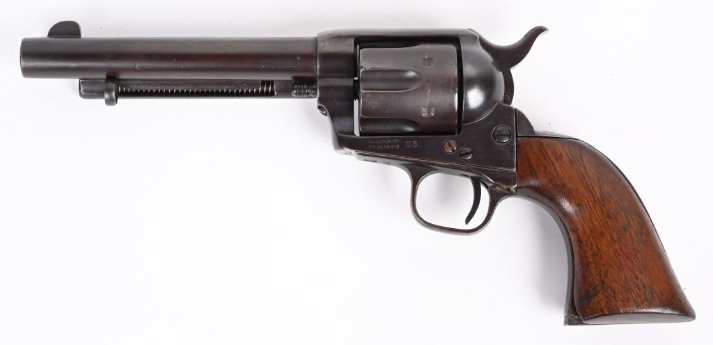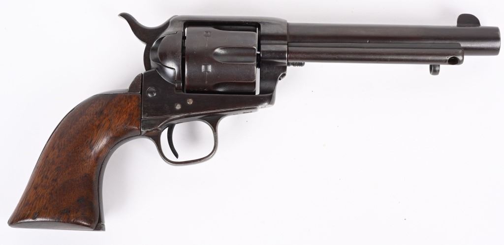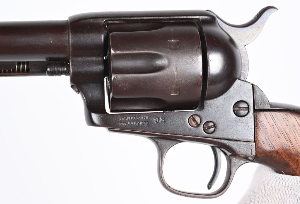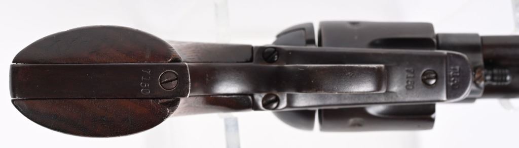 SRIAL 7150. BARREL 5.5". CALIBER .45 COLT MADE IN 1874. All matching numbers to include barrel, cylinder, frame, grip strap and back strap. Two line address on left side of frame with "US" stamp. Cylinder has an Ainsworth "A" inspection stamp with no other visible inspector stamps. This appears to be an 1890's rebuild into artillery model but numbers not mixed. Early features include the bulls eye ejector rod head, one piece walnut grips. Condition. All metal reblued to a blue brown patina mix. Visible legends are crisp. Top of barrel is re-stamped. Condition. Deep re-applied brown finish, chip off grips that were refinished. Indexes like new. Bore is strong with residue. Has a deep dark brown blue patina finish. ANTIQUE
