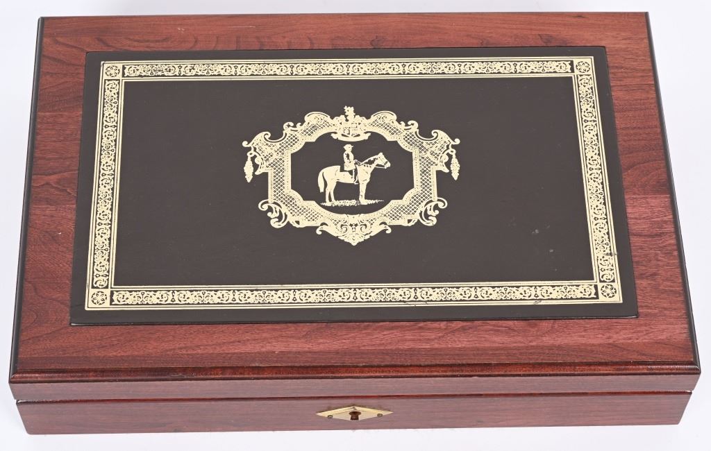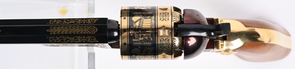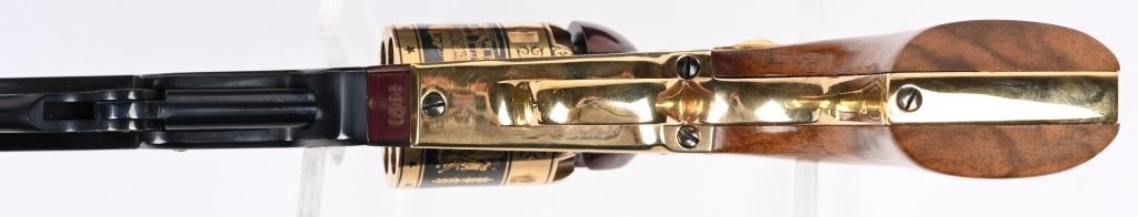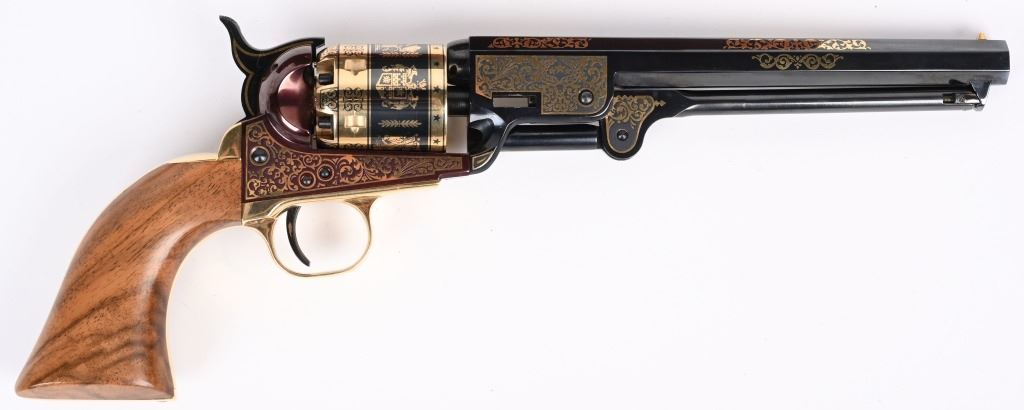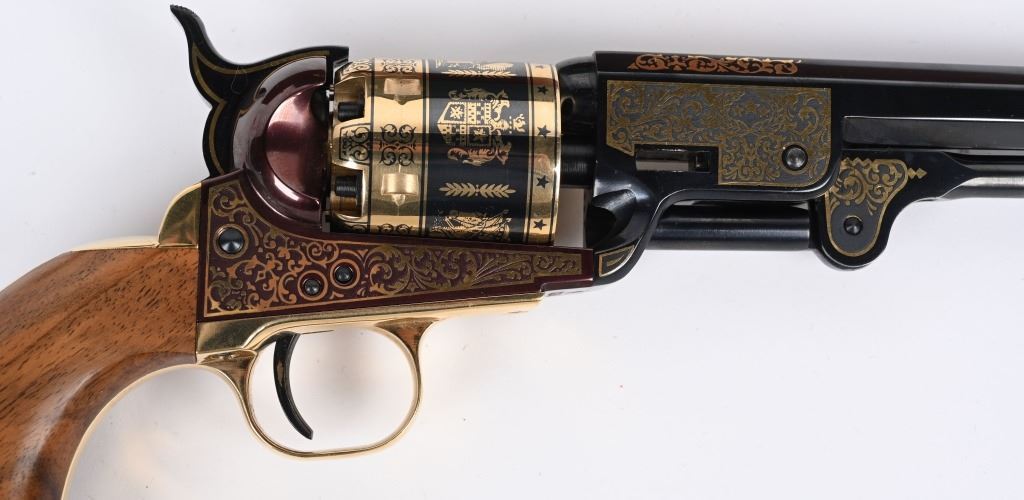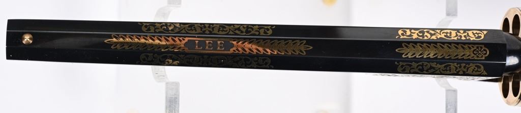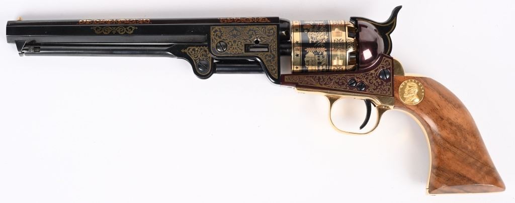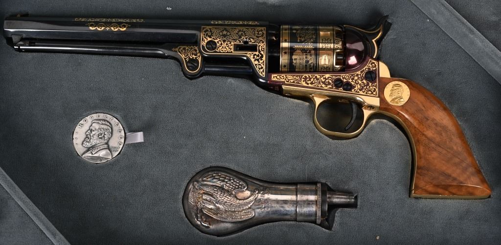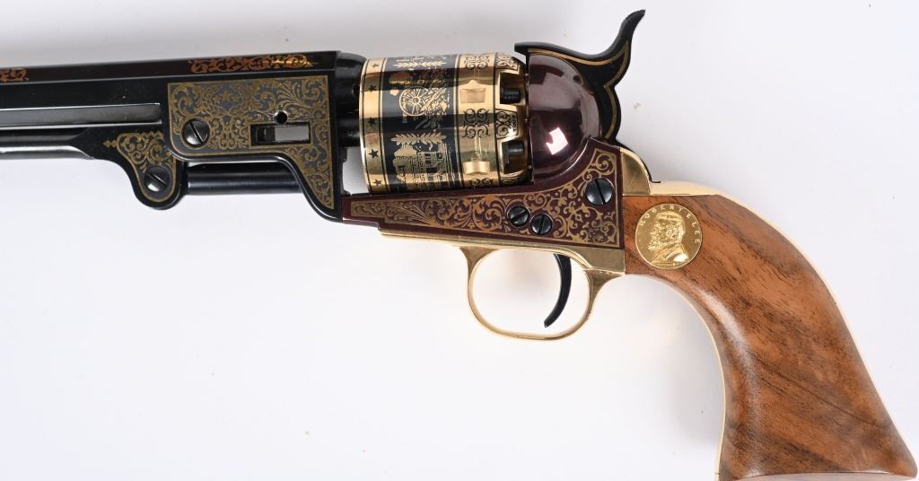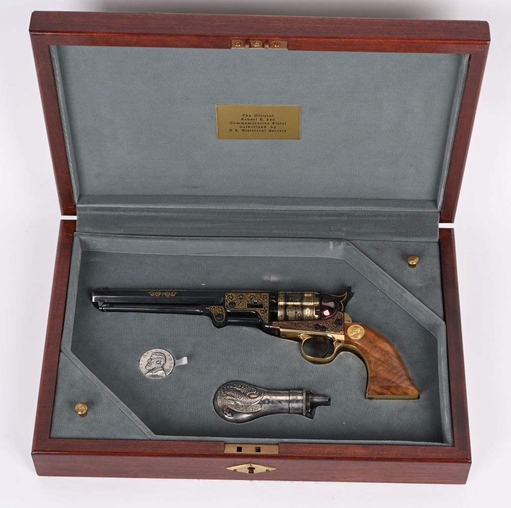This is an unfired 1851 Navy that was made by the U.S. Historical Society to commemorate Robert E. Lee. Features a high polish blue finish with gold damascene decorative scroll, smooth walnut grips with a gold Robert E. Lee bust medallion in left oil finished grip panel. Top flat of barrel marked LEE with gold leaf , cylinder scene has momentous southern theme in gold. Revolver is housed in a gray velvet lined wood casing with gold embossed leather panel on the lid featuring the iconic "Lee on Traveler" image. Included in the presentation case is a silver plated powder tin and coin. These guns were "authorized" by the Williamsburg Firearms Manufactory and were limited to a total issue of 2,500 units that were originally priced at $2,100 when issued circa 1984.This is number 1286. Condition Near new. NO FFL.
