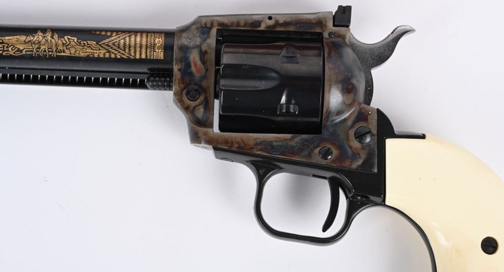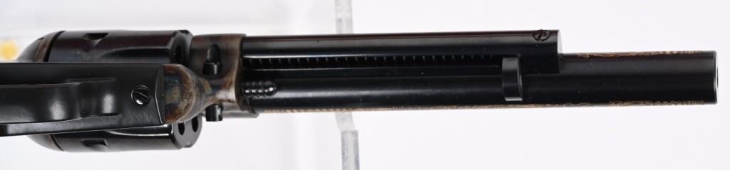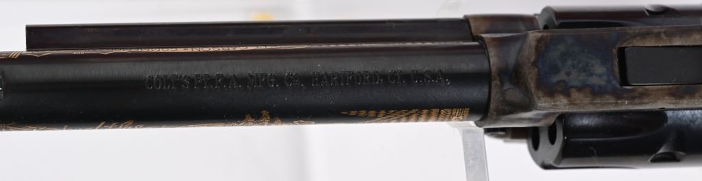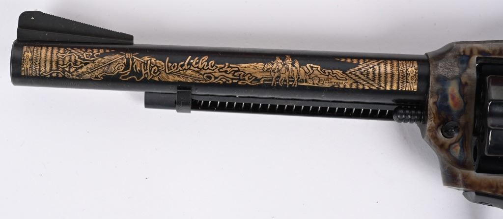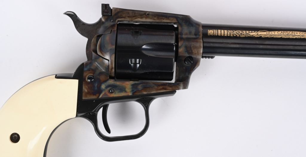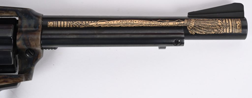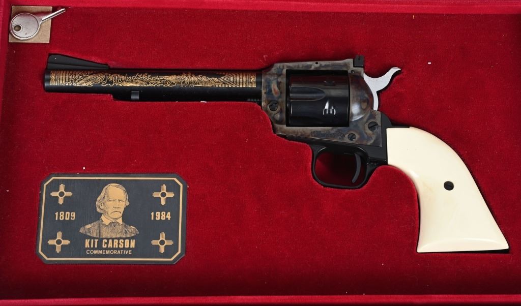 SERIAL KCC0923. BARREL 6". CALIBER 22. MADE IN 1984.IN WHICH 1000 WERE PRODUCED. Features blue and case color finish, target rear sight on flat top frame, faux ivory 2- piece grips, Gold damascene decorated barrel with Kit Carson theme. Comes in walnut display case with special book and plate. Also comes with original cardboard box. Condition. Unfired. MODERN