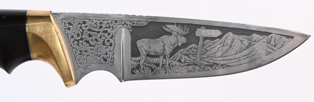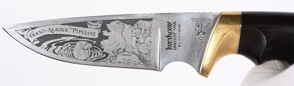 SERIAL 91484SA BARREL 7.5". CALIBER 45 COLT. This set celebrates the 1977 completion of the 801-mile-long Trans-Alaska pipeline. This set commemorates milepost #484 OF 801. Special features include scarce full blue finish, no cylinder flutes, eagle plastic grips with special barrel inscription on left side. Comes in original shipping crate, individual Colt cardboard box, and includes a boxed special edition Kershaw knife with Alaska Pipeline etching on both sides of the blade with sheath. MODERN