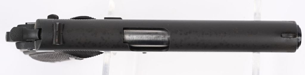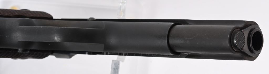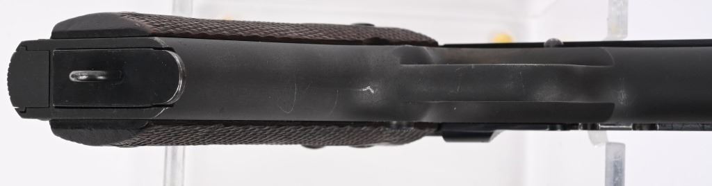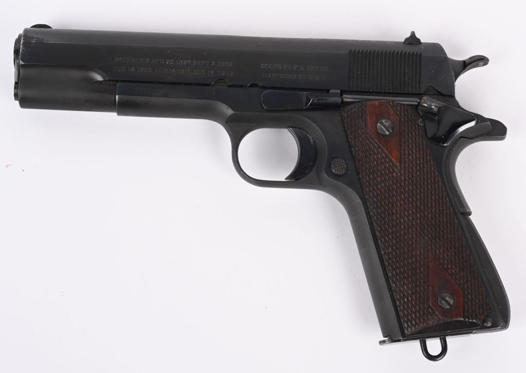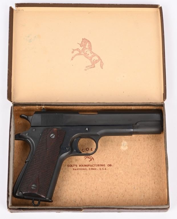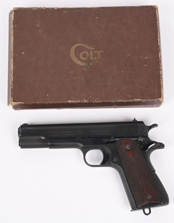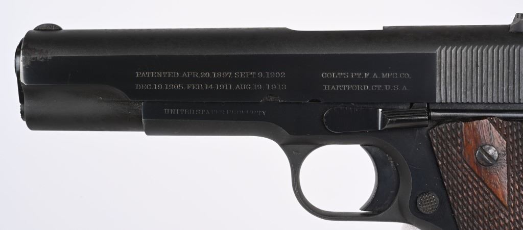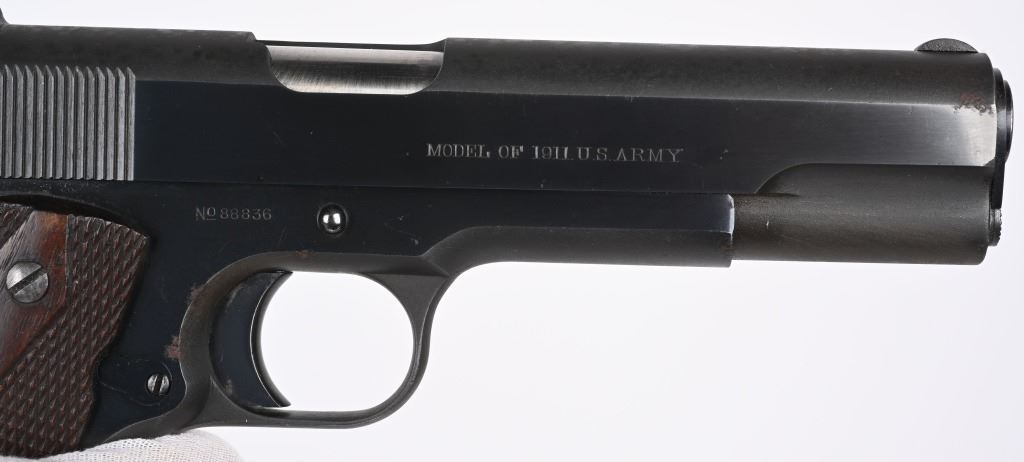SERIAL 88836. BARREL 5". CALIBER 45 ACP. MADE 1914. Early mfg. Army model that appears to have been sent back to factory and refinished to near mint condition. They put the two tone blue much like a pre series 70 , beautifully polished with sharp straight edges, sharp legends but no eagle head on left side. VP proof on guard. Model of 1911 US ARMY on right side of slide. Patent dates on left side of slide and "UNITED STATES PROPERTY" on left side of frame. Correct early features include long smooth trigger, diamond checkered walnut grips, two tone tempered magazine with lanyard loop, later serrated arched main spring housing, bevel edge square notch rear sight (later) , wide spur checkered hammer, checkered safety, serrated slide stop (later, newer barrel. Comes in 1950's Colt box with no end label, probably the one they shipped the gun back with. Condition. Solid 98% with few areas of high edge wear and a couple of age spots. Fine bore and excellent grips. C&R