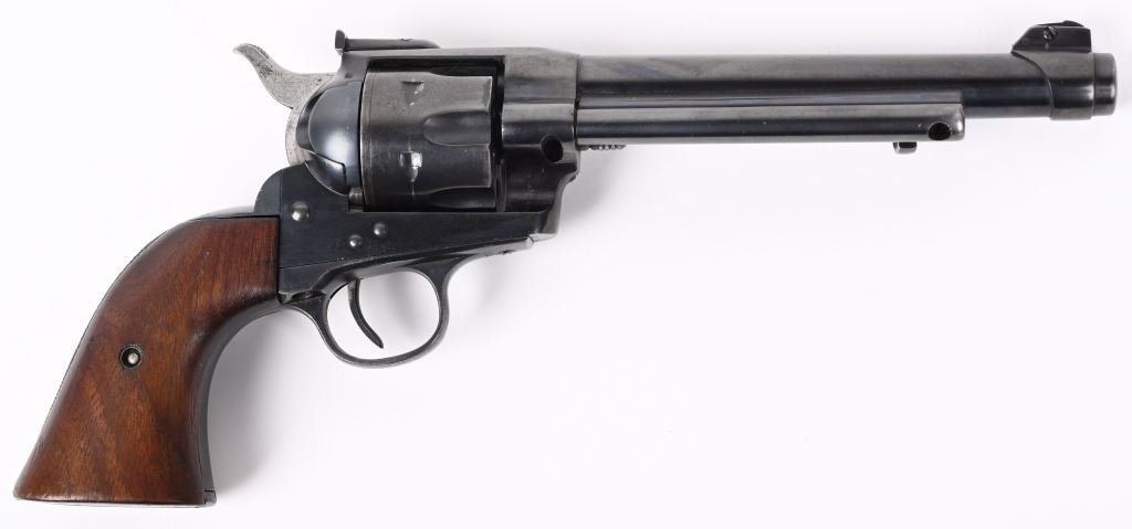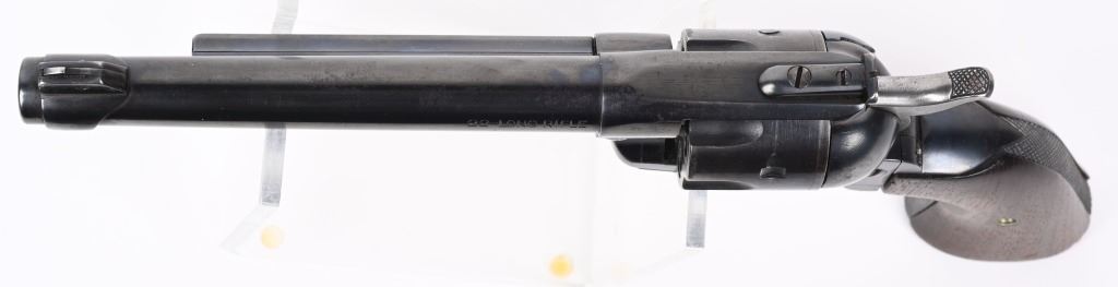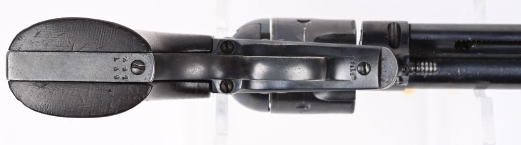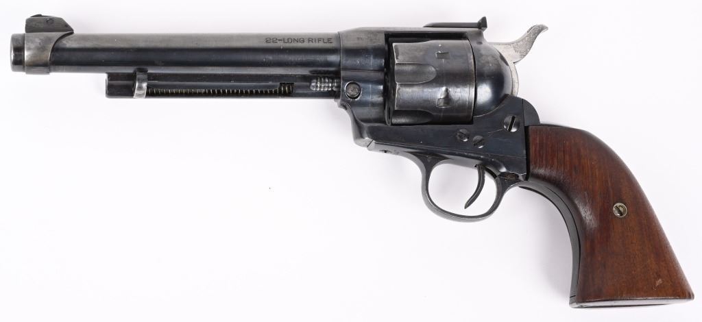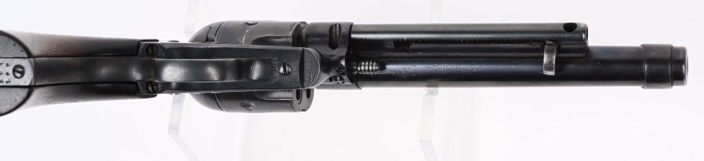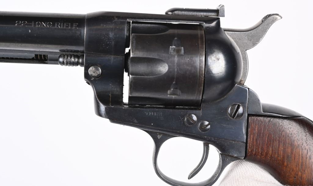 SERIAL NUMBER: 297189. BARREL: 6-1/2". CALIBER: .22LR. MANUFACTURED: 1907. Original Colt SAA frame, with a sleeved barrel in .22 LR, as marked on the left side. "VP" proof and patent dates are faintly visible, as is the circled rampant colt. Matching serials remain on the butt, frame and trigger guard. Blade front sight, with u-notch rear. Six shot fluted cylinder has been sleeved to .22LR. Re-blued finish. Smooth finish wood grips. Cut checkering on the backstrap. CONDITION: Metal is good overall, with general wear and scratches. Grips have a few scratches, and are ill fitting. Bore is shiny with crisp rifling. Hammer and cylinder are tight. Hammer does not hold at first click. C&R