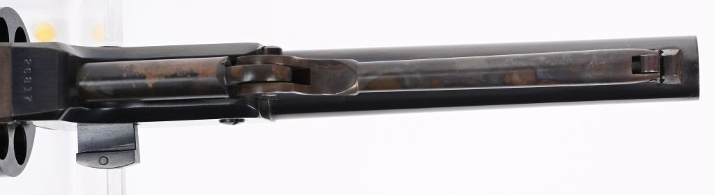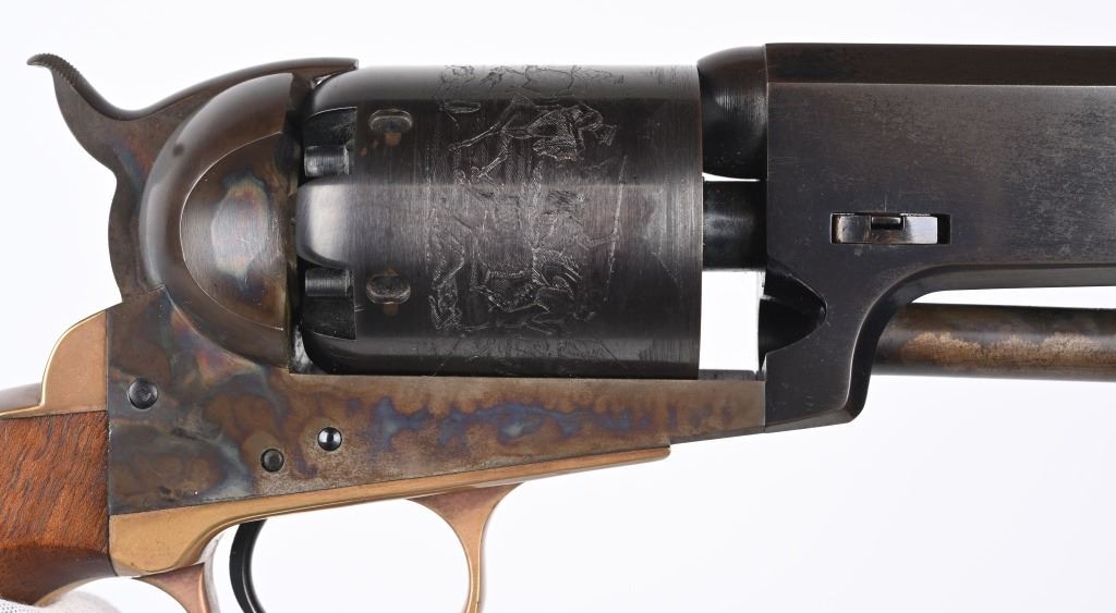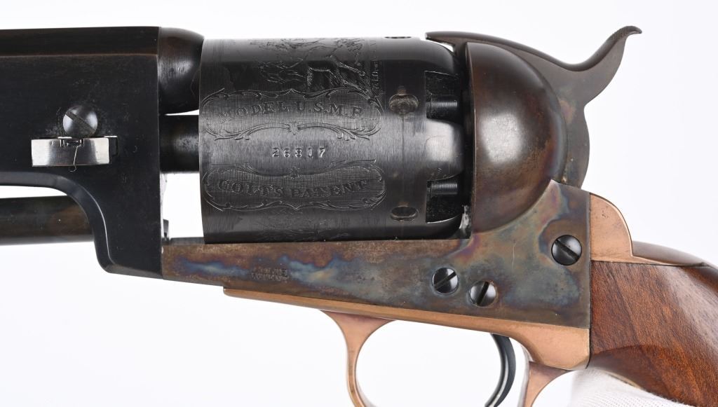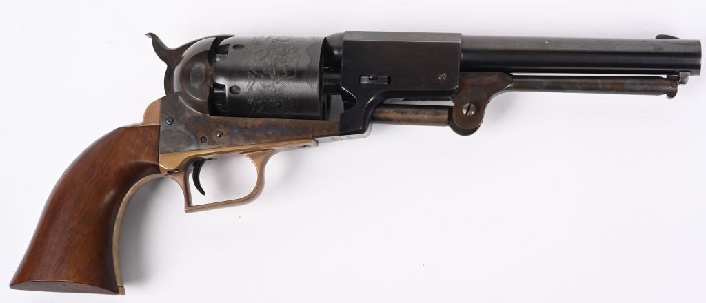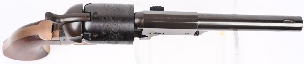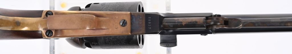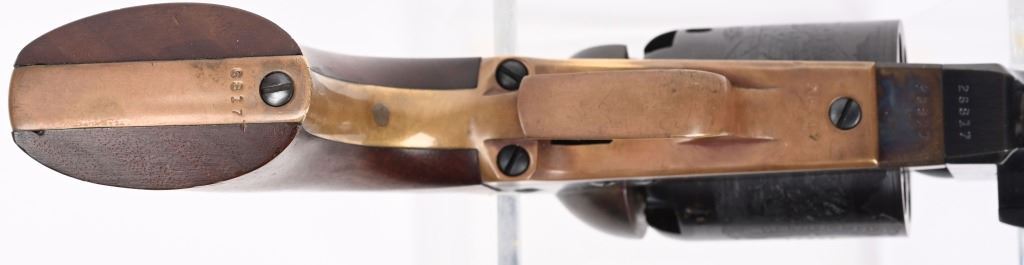 SERIAL NUMBER: 26817. BARREL: 7-1/2". CALIBER: .44 CAL. MANUFACTURED: 1970'S. Made as a close copy of the original gun. Markings even imitate the original. New York address on the top of the barrel. Matching serials. Original blued/case colored finishes. Brass grip straps. Original oiled wood grip. CONDITION: Metal is very good overall, with a few light handling marks. Some wear on the loading lever. Grip straps are tarnished. Grip has a few minor impressions. Bore is shiny with crisp rifling. Sharp nipples, with no signs of dry firing. Tight hammer and cylinder. ANTIQUE/BLACKPOWDER