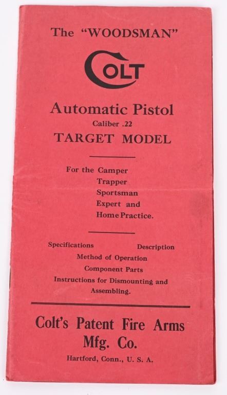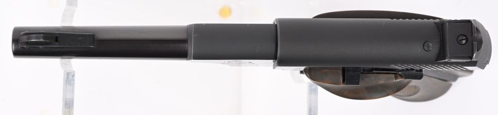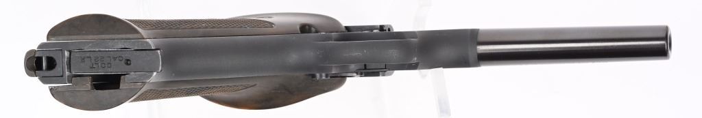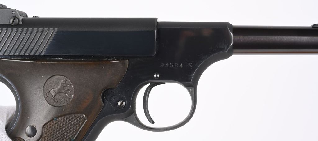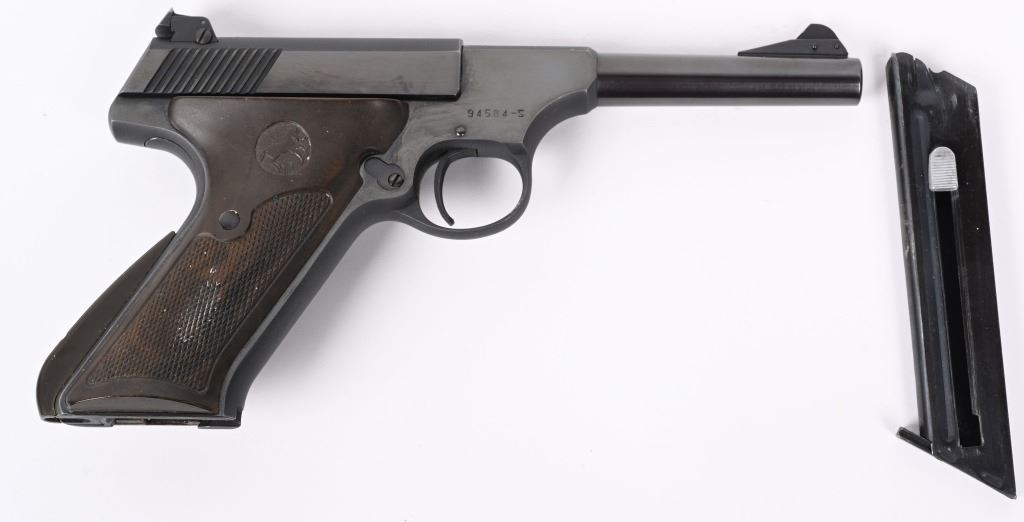 SERIAL NUMBER: 94584-S. BARREL: 4-1/2". CALIBER: .22LR. MANUFACTURED: 1951. Standard markings and features. Ramped blade front sight and adjustable u-notch rear. Original blued finished and checkered brown plastic grips. Includes original blued steel magazine and red instruction booklet. CONDITION: Metal and grips are excellent overall, with a few handling marks. Bore is shiny with crisp rifling. Mechanically fine. Magazine is excellent. C&R