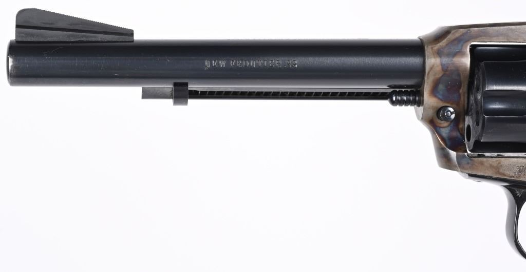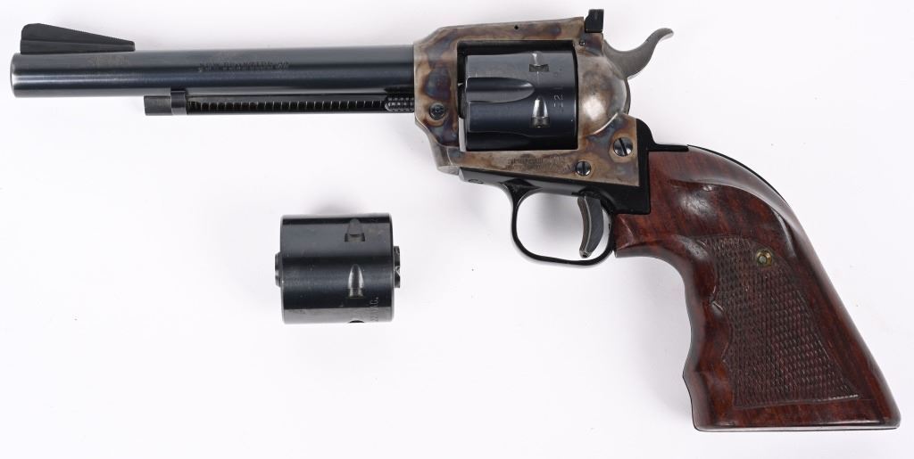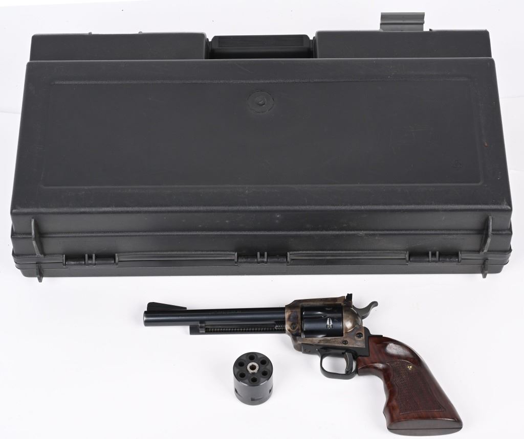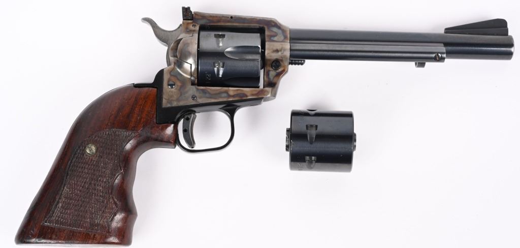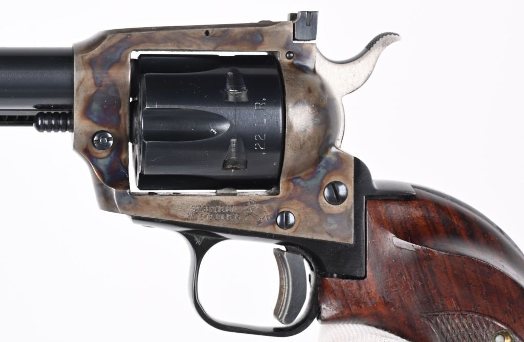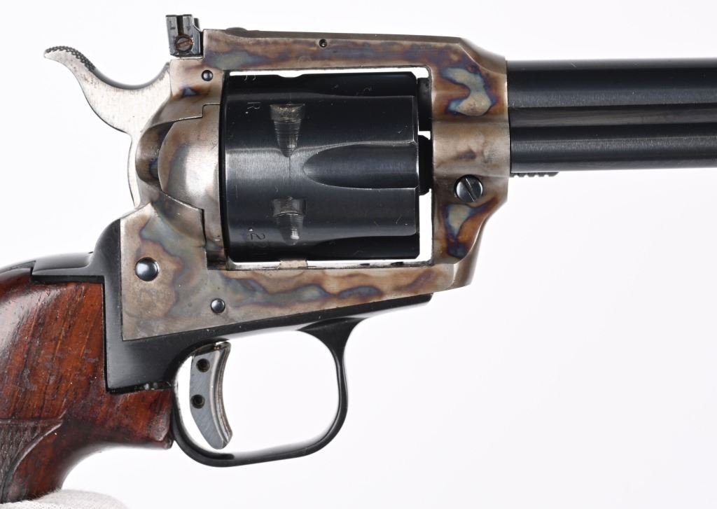 SERIAL G41017. BARREL 6". DUAL CYLINDERS 22 LR & MAGNUM. MADE IN 1973. Blue and case color finish, six shot, single action, flat top frame, target rear sight, ramp front sight. Trigger shoe added along with custom Roper style walnut checkered grips. Condition. Near mint with 97% finish, light muzzle wear, couple handling marks on back strap, light drag line. Fine bore and action. Grips excellent. C&R