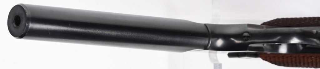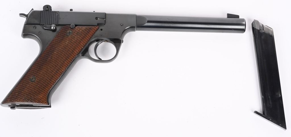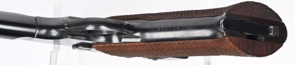 SERIAL 222118. BARREL 6 3/4". CALIBER 22 LR. MADE IN 1947. Features high polish blue finish, fully checkered walnut grips, adjustable target rear sight, and exposed hammer. Condition. 95% blue with wear at muzzle. There is a 1/2" area of wear on left side of grip frame from a thumb. Balance of blue is bright. Grips are excellent. Bore is bright. Comes with one two tone tempered magazine. C&R