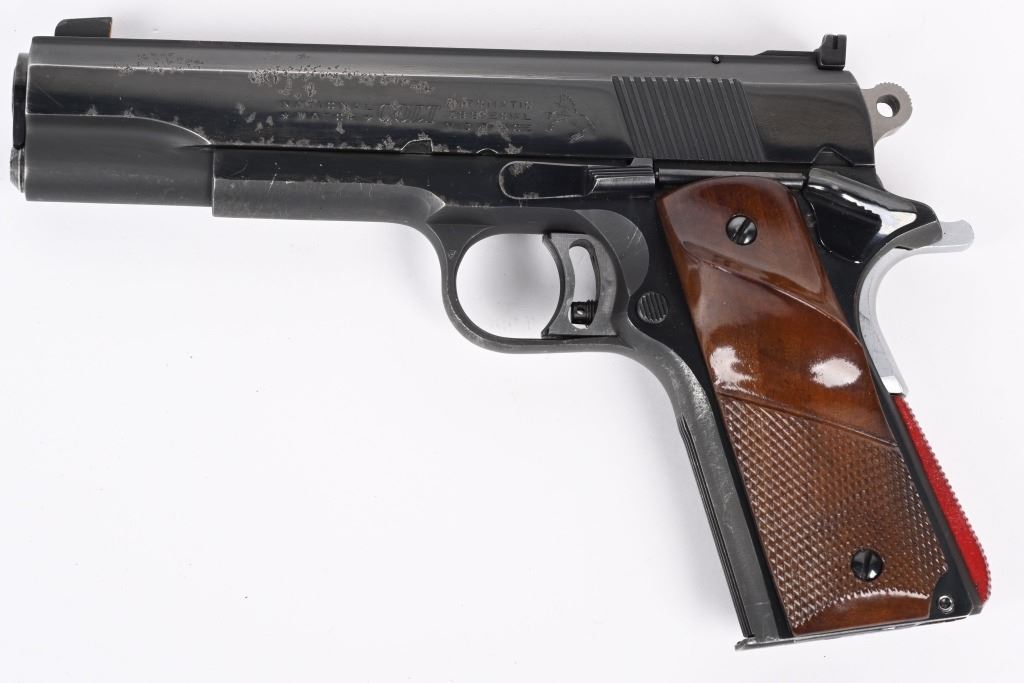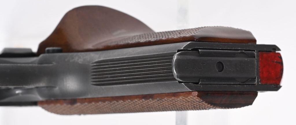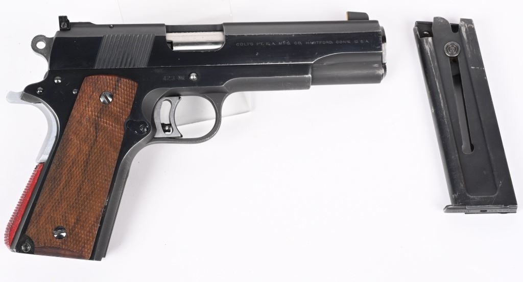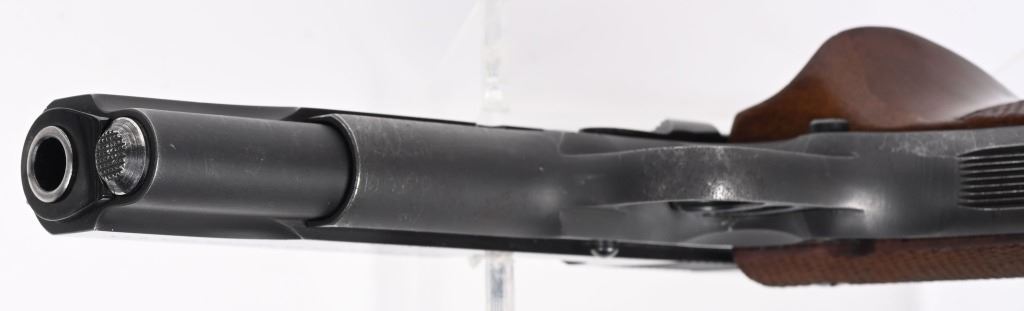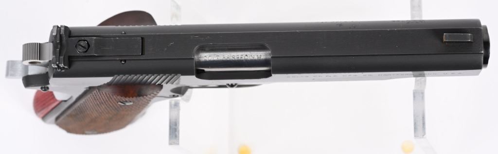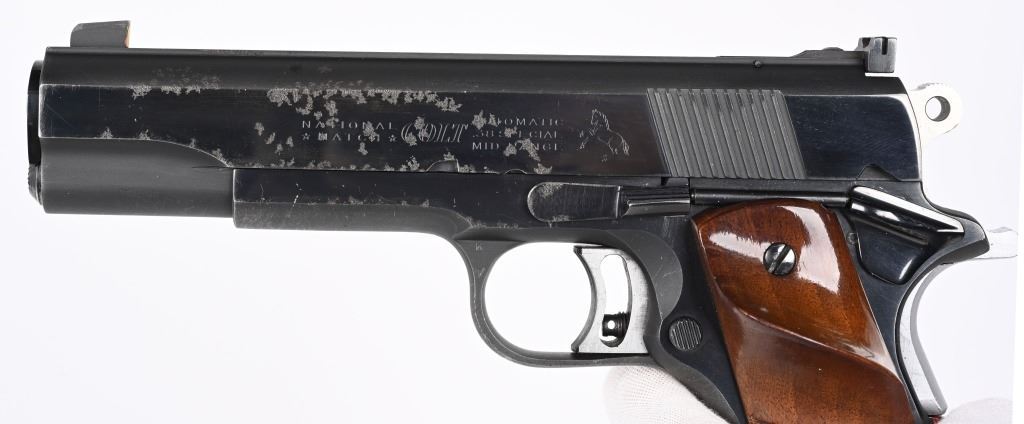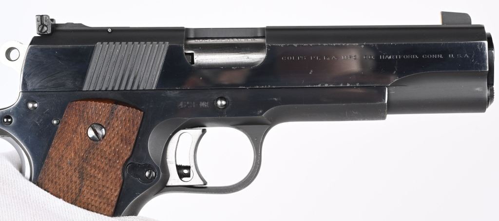 SERIAL 423-MR. BARREL 5". CALIBER .38 WADCUTTER. MADE IN 1960. Only 8000 made from 1960-1971. Slide is stamped National Match and features target rear sight, two tone blue finish, custom thumb wrist checkered walnut grips, red painted arched main spring, adjustable trigger, light weight hammer, properly stamped barrel & magazine. Comes with full checkered walnut grips. Grips safety is after market light weight. Condition. At least 95% blue with scattered handling marks. Unfortunately, the left side of the slide has scattered freckling from poor storage and should be restored. Bore is fine as are grips. C&R