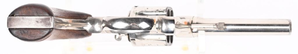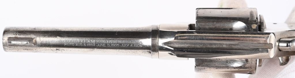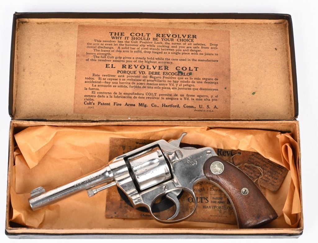 SERIAL 1764. BARREL 4". CALIBER 38. MADE IN 1905. Features full nickel finish, fixed sights, silver medallion walnut grips. Comes in an original box but for a pre war 5" blue gun. Condition. About 80 % nickel remains with usual minor flaking and high edge wear. Grips are from another gun and have been sanded. Bore and action are fine. C&R