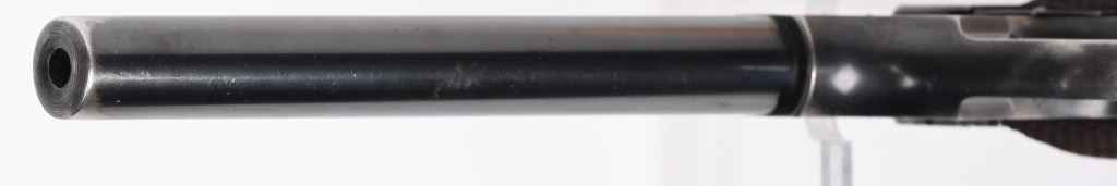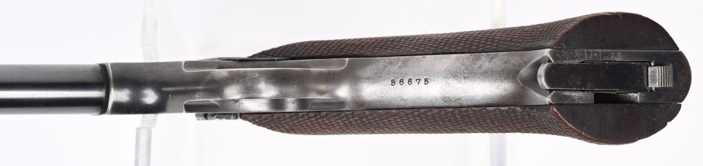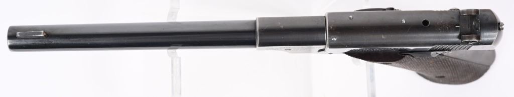 SERIAL 56675. BARREL 6 3/4". CALIBER .22LR. MADE IN 1939. Fine pre war features blue finish, target sights, fully checkered walnut grips with flared base, an original two tone tempered magazine. Condition. Straps are patina. Blue thinning on sides of barrel. Frame shows high edge wear and minor handling. Bore is excellent. C&R