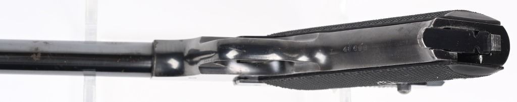 SERIAL 48699. BARREL 6 3/4". CALIBER .22 SHORT. MADE IN 1939. Has correct tempered magazine. black checkered wood grips, blue finish, target sights. Condition. Fine with 95% blue. Thinning on front strap, minor high edge wear and few handling marks. Grips are near mint. Fine bore. C&R