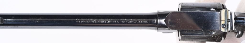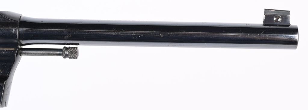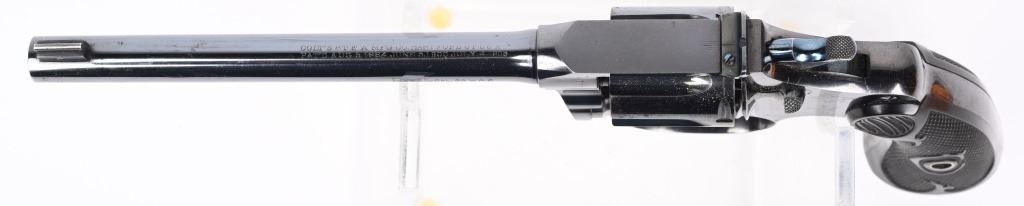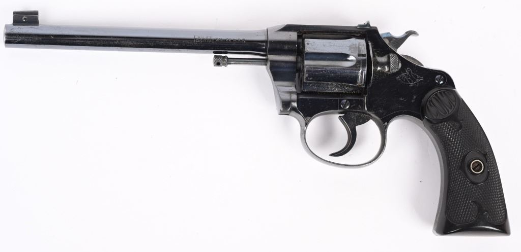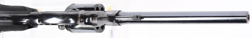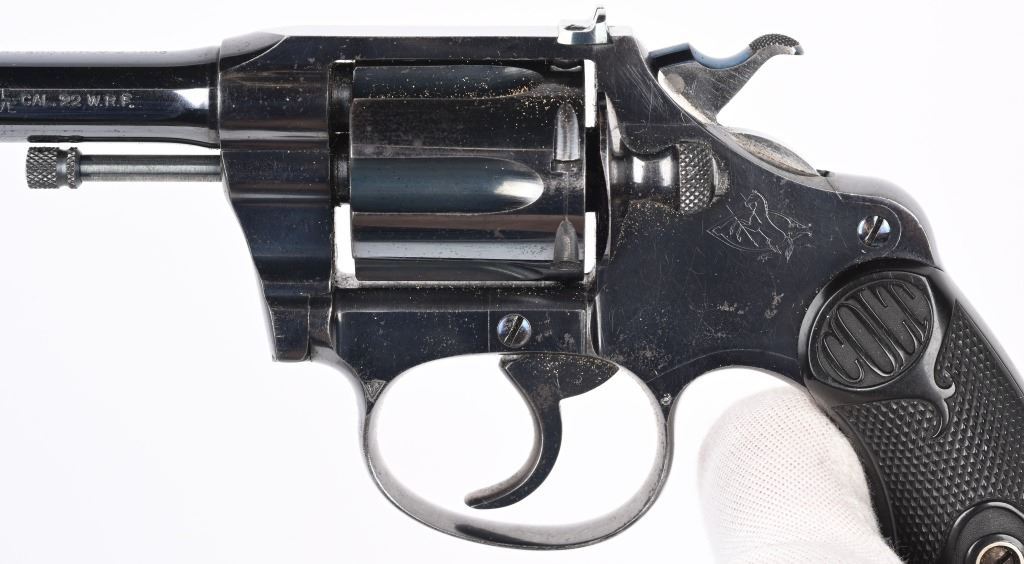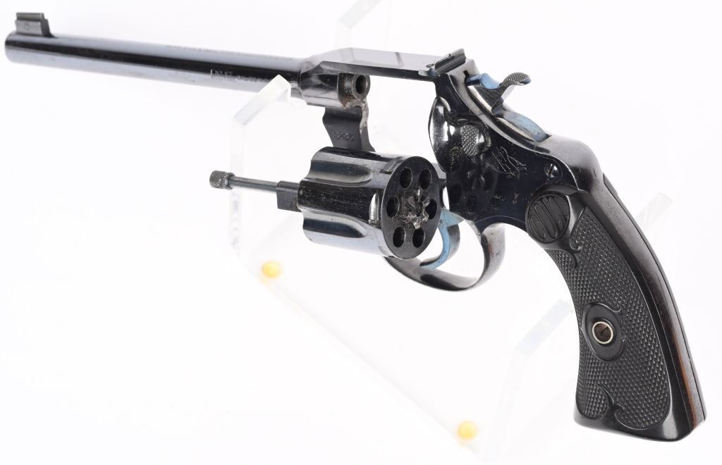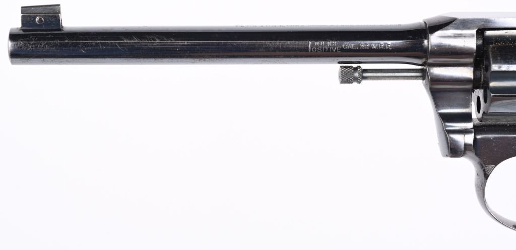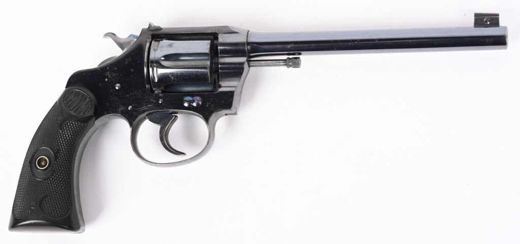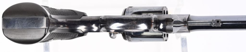 SERIAL 3235. BARREL 6". CALIBER 22 WRF. MADE IN 1910, 1ST YEAR PRODUCTION.. Features flat top frame with high polish finish, adjustable front with windage rear sights, six shot, double action, gutta percha grips, fire blue hammer and trigger. Condition. Rear strap is thinning. Cylinder has light drag line. Frame has some minor high edge wear and couple of spots, solid 97% gun overall with excellent grips, strong bore and fine action. C&R